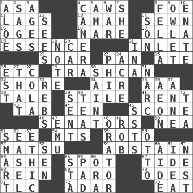 ACROSS 1. White ___ sheet 4. Crow sounds 8. Enemy 11. Fails to keep up a pace 13. Nursemaid 14. Stitched 15. Double curve, resembling the letter S 16. Female horse 17. Spanish pot 18. Center 21. An arm off of a larger body of water 22. Fly high 23. Baking dish 25. Had dinner 26. And so on (abbr.) 29. File 13 32. Dinah or Pauly 34. Atmosphere 35. American Automobile Association (abbr.) 38. Lie 39. Vertical member of a panel or frame 41. Monthly bill 43. Bar bill 44. Car or cant ending 45. Biscuitlike quick bread 46. Legislators 50. Teachers' org. 51. Observe 54. Mountains (abbr.) 55. Printing process, for short 57. Taiwanese island in East China Sea 59. Refrain by choice 63. American tennis player Robert 64. Blemish 67. Periodic rise and fall of the sea level 68. It's straight from the horse's mouth 69. Pacific island yam 70. Lyric poems 71. Affectionate concern, for short 72. The sixth month of the Jewish calendar 73. Erode DOWN 1. _ vera 2. Sinks 3. Ripens 4. Device for capturing images 5. Nanny (var.) 6. Armed conflict 7. A female animal or person 8. Chap (slang) 9. A small or young owl 10. Maternal 12. Perceives with the eye 14. Boy, to dad 19. Make mention of 20. 4-wheeled motor vehicle 21. _ tizzy (2 wds.) 23. Silvers or Donahue 24. Land measure 26. Eastern Standard Time (abbr.) 27. Not this but _ 28. Root beer relative 30. Inhabitant of Heaven 31. Drug cop 33. Confederate soldiers (slang) 36. A really long time 37. Queen of England 1702-14 39. Posted 40. Beverages made from leaves 42. Beverage made from leaves 45. Fast planes 47. Australian flightless bird 48. Speaker 49. Director Reiner 51. Don Adams' spy role 52. Artist's stand 53. Value system 56. "Beetle Bailey" pooch 58. Elected rep. 60. Assistant 61. The content of cognition 62. Egg locale 64. R.R. building 65. Writing tablet 66. Mouth or opening