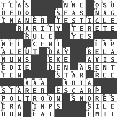 ACROSS 1. Beverages made from leaves 5. Compass dir. 8. Bear (Spanish) 11. Do over again 12. Oceans 13. Tired old horse 14. Sillier 17. One of the two male reproductive glands 19. Noteworthy scarcity 21. Cylindrical with tapered ends 22. Court order 23. Consenting reply 24. Cartoonist voice _ Blanc 27. Penny 29. Infant locale 32. Eskimo relative 34. 24 hours 36. Actor Lugosi 37. Religious women 38. Supplement with great effort 39. Advice 40. Singer Brickell 41. Lair 42. Rep 43. Nine, plus one 44. Play the lead 46. To sift 47. Auto club (abbr.) 50. Roberta Peters solo 52. A viewer who gazes fixedly 55. Fortification 57. Coward 59. Sounds asleep 62. Epoch 63. Naughty children 64. Drop; flow; fall 65. Spanish title 66. Erode 67. Give off DOWN 1. Three (prefix) 2. Car or cant ending 3. The sixth month of the Jewish calendar 4. Underwater navigation system 5. Born 6. Smutty 7. First name in cosmetics 8. At one time in the past 9. Table seasoning 10. Double curve, resembling the letter S 12. Filthy place 15. Spew [out] 16. Cause heat under the collar 18. Big collection agency 20. Looked after 24. French painter Edouard 25. Dodge 26. Soviet premier 1918-24 28. Proceeds 29. Prying instrument 30. Place in a line 31. Thick mixture 33. Purpose 35. Gossips 36. Paper or plastic container 42. Believer in; advocate of (suffix) 45. Arches 47. Nonscientific branch of learning 48. Nest on high 49. Odor 51. Came up 52. Broke a traffic law 53. "Corrida" creature 54. Actor Alda or Thicke 55. Followers of ems 56. Demure 58. Elect 60. Biblical high priest 61. Arrange properly for use