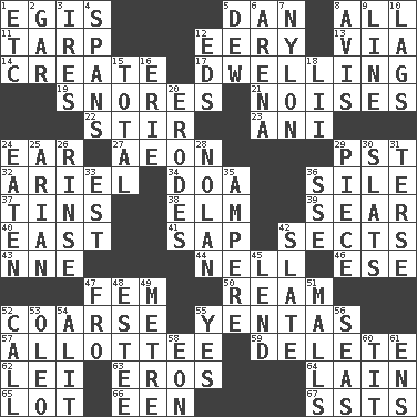 ACROSS 1. The front part of a cuirass 5. One of the 12 tribes of Israel 8. 100% 11. Canvas cover 12. Suggestive of the supernatural 13. By way of 14. Make 17. Home 19. Sounds asleep 21. Annoying sounds 22. Commotion 23. Cuckoo 24. Hearing organ 27. Period of immesurable duration 29. Pacific Standard Time (abbr.) 32. Satellite of Uranus 34. ___ good deed 36. Filth; sediment 37. Canisters 38. Shade tree 39. Scorch 40. Compass direction 41. Plant excrement 42. Religious groups 43. Compass dir. 44. 1994 drama film starring Jodie Foster 46. Compass dir. 47. Opposite of masc. 50. 480, 500 or 516 sheets of paper 52. Rough 55. Gossips 57. One to whom something is allotted 59. Erase 62. Luau accessory 63. Greek god of love 64. (Had) reclined 65. Car dealer's back yard 66. Car or cant ending 67. Fast planes DOWN 1. And so on (abbr.) 2. Slender fish 3. Angers 4. Connects, as a bridge 5. Morning condensation 6. Sports stadium 7. High-strength synthetic material 8. Opinion 9. Actor's bit 10. Straggles 12. Begley and Asner 15. Add up to 16. One of the Great Lakes 18. Cards in a Roman deck? 20. Eats (away) 24. Eroded 25. Believer in; advocate of (suffix) 26. Wash lightly 28. Pitcher Ryan 29. Part 30. Narrow boards 31. Laconic 33. Eastern Standard Time (abbr.) 35. Electrical Unit 36. Compass dir. 42. Chalkboard 45. Grant temporary use of 47. Away 48. First name in cosmetics 49. Distance measurement (Brit.) 51. Promenades 52. Give a ring to 53. Butter sub 54. Came down and settled, as after flight 55. Consenting reply 56. Oceans 58. A really long time 60. Teat (slang) 61. Followers of ems