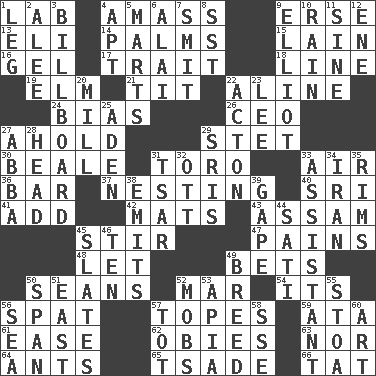 ACROSS 1. Experiment locale 4. Collect or gather 9. Celtic language 13. Biblical high priest 14. Insides of hands 15. (Had) reclined 16. Set 17. Distinguishing feature 18. Actor's bit 19. Shade tree 21. Teat (slang) 22. Place in a line 24. Prejudice 26. Corporate head (abbr.) 27. Hold, grip (Informal) 29. Proofreading order 30. Memphis, Tenn. Street 31. "Corrida" creature 33. Wind 36. Soap unit 37. Nestling 40. _ Lanka 41. Increase 42. Floor protectors 43. Indian state 45. Disorderly outburst 47. Aches 48. Allow 49. Wagers 50. Actors Connery and Penn 52. Third mo. 54. ___ a Wonderful Life 56. Petty quarrel 57. Drinks excessively 59. _ moment's notice (2 wds.) 61. Relaxation 62. Off-Broadway awards 63. Not either 64. Pismires 65. Sadhe (variant) 66. Make lace DOWN 1. Part of a journey 2. Toward shelter 3. Big road sign 4. Fitting 5. Shops 6. Mountain range southwest of Kyrgyzstan 7. Stricken, poetically 8. Fast jet (abbr.) 9. American author Paul (1891-1958) 10. Precipitation 11. Trig term 12. Compass dir. 20. Place where flour is made 22. Gambison 23. Area sheltered from the wind 25. An important port of Yemen 27. Swedish rock group 28. Froth on beer 29. Indian titles of respect 31. Russian ruler of old 32. Baseball player Mel 33. Aide 34. SW Asia republic 35. Basketball hoops 38. Gives off 39. Yawn 44. Suttee (variant) 45. Chalkboards 46. Nine, plus one 49. A special lineage 50. Connect, as a bridge 51. 90 degrees 52. Crowds into 53. Capital of Western Samoa 55. Portico 56. Ocean 57. Small child 58. Compass dir. 60. Nonscientific branch of learning