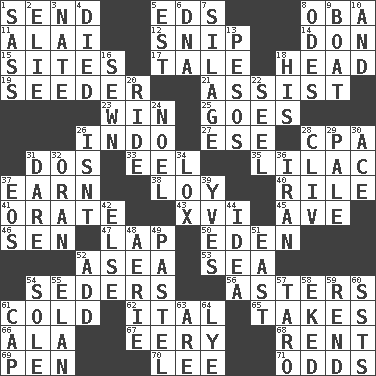 ACROSS 1. Post 5. Begley and Asner 8. Chief or king in Benin or Nigeria 11. Jai ____ 12. Sever or remove by pinching or nipping 14. Spanish title 15. Locates 17. Falsehood 18. Froth on beer 19. Sowing specialist 21. Help 23. Victory 25. Moves 26. Southeast Asian peninsula 27. Compass dir. 28. Tax preparer (abbr.) 31. Two (Sp.) 33. Snakelike fish 35. Pale purple color 37. Merit 38. Myrna of the movies 40. Cause heat under the collar 41. Declaim 43. 16 45. "___ Maria" 46. Elected rep. 47. Pet locale 50. Genesis locale 52. Toward the sea 53. Ocean 54. Spring feasts 56. Michaelmas daisies 61. Having a low temperature 62. Slanted text style (abbr.) 65. Receives possession of 66. In the manner of 67. Suggestive of the supernatural 68. Monthly bill 69. Fenced enclosure 70. Area sheltered from the wind 71. Likelihood DOWN 1. Backtalk 2. Writer Wiesel 3. Nathan's nickname 4. Passed on 5. Eastern Standard Time (abbr.) 6. Heredity factor (abbr.) 7. Fodder prepared in a silo 8. Lyric poems 9. Water vessel 10. Added to 13. Mexican monetary units 16. Stitched 18. Part of HMS, perhaps 20. Travel on an animal 22. Sew up the eyelids of hawks and falcons 24. Christmas carol 26. Is not 28. 154 in Roman numerals 29. Light colored 30. Adept person 31. Have the gumption 32. Northwest Algerian city 34. Brine-cured salmon 36. SW Asia republic 37. Greek goddess of the dawn 39. Jacques Cousteau's middle name 42. Otherwise 44. The main thing one is thinking about 48. Nest on high 49. Soft color 51. Compass direction 52. Increase 54. Flatfish 55. Liveliness 57. Edible starchy tuberous root 58. Supplemented with great effort 59. Tear apart 60. Fast planes 61. Head covering 63. "We ___ not amused" (Victoria) 64. Sodium hydroxide
