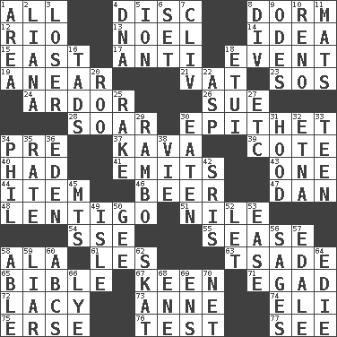 ACROSS 1. Everything 4. Plate 8. Dormintory (informal) 12. River (Sp.) 13. Christmas carol 14. The main thing one is thinking about 15. 90 degrees 17. Opposed to 18. Incident 19. Approach 21. Large container 23. Distress signal 24. Zeal 26. Take to court 28. Fly high 30. Curse 34. Before (prefix) 37. Polynesian shrub of the pepper family 39. ____ d'Azur (French Riviera) 40. Possessed 41. Gives off 43. Single 44. A whole individual unit 46. Fermented drink made from hops 47. One of the 12 tribes of Israel 48. Small, flat, pigmented spot on the skin 51. The longest river in the world 54. Compass dir. 55. Gospel singer Marvin 58. Chicken ___ king 61. French article 63. Sadhe (variant) 65. Instruction Manual for Humans 67. Peachy ____! 71. Mild oath 72. Made of lace 73. Queen of England 1702-14 74. Biblical high priest 75. Celtic language 76. Trial 77. Perceive with the eye DOWN 1. Type of rug 2. Climbing, woody, usually tropical vines 3. Failure 4. Heredity factor (abbr.) 5. Electrically charged atom 6. Arrange properly for use 7. 154 in Roman numerals 8. HTML Container Element 9. Lyric poems 10. Western Nevada city 11. Floor coverings 16. Small boys 18. Needle case 20. Friend of Pooh 22. Viper 25. Immoral or dissolute person 27. And so on (abbr.) 29. Role for Stallone 30. Consumed 31. Parka part 32. Inactive volcano in Sicily 33. Adolescent 34. Silvers or Donahue 35. Assign a rank or rating to 36. Locale of original sin 38. Compete 42. Indian titles of respect 45. Mountains (abbr.) 49. Small island 50. Unit of force equal to gravity 52. Allow 53. Relaxation 56. Gurus 57. Peak District village in England 58. Competent 59. One who doesn't tell the truth 60. Lettered men learn these first 62. Three-handed card game 64. Singer Brickell 66. Potassium hydroxide 68. Compass dir. 69. Followers of ems 70. Remaining after all deductions
