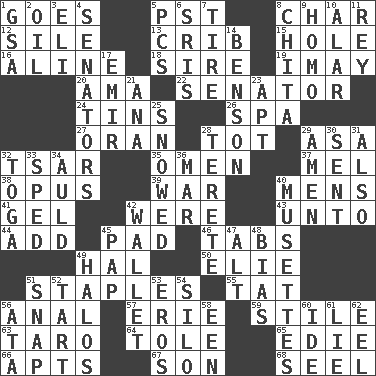 ACROSS 1. Leaves 5. Pacific Standard Time (abbr.) 8. Burn to charcoal 12. Drop; flow; fall 13. Baby bed with high sides 15. Hollow 16. Place in a line 18. The founder of a family 19. "If ____ say so..." 20. Nanny (var.) 22. Legislator 24. Metal containers 26. Health resort 27. Northwest Algerian city 28. Small child 29. White ___ sheet 32. Russian ruler of old 35. Sign of something about to happen 37. Cartoonist voice _ Blanc 38. Musical composition 39. Armed conflict 40. Not women's 41. Set 42. Past tense of be (plural) 43. To (old English) 44. Increase 45. Writing tablet 46. Bar bills 49. Actor Linden 50. Writer Wiesel 51. Paper fasteners 55. Make lace 56. Of or related to the anus 57. 4th largest of the Great Lakes 59. Vertical member of a panel or frame 63. Edible starchy tuberous root 64. Lacquered or enameled metalware 65. Singer Brickell 66. Flats, for short 67. Male offspring 68. Sew up the eyelids of hawks and falcons DOWN 1. Girls' org. (abbr.) 2. Lubricate 3. Connecticut Ivy Leaguer 4. Elected representatives 5. Personal Computers (abbr.) 6. Indian titles of respect 7. Hoop that covers a wheel 8. Riviera of "Kiss of the Spider Woman" 9. Same (prefix) 10. Having or resembling wings 11. Marina Del _, California 14. Gillaume's butler role 17. Arab leader 21. Santa ___, CA 23. Fitting 25. Frozen precipiation fell 28. Cylindrical with tapered ends 29. So be it 30. Emitted 31. In addition 32. Ancient Roman robe 33. Drove too fast 34. Old (Scot.) 36. Third mo. 40. French bagpipes 42. Place for singles 45. Infant food 47. The first octave above the treble staff 48. Prejudice 49. Radiant circles of light 51. Fastener 52. Small pie 53. Greek god of love 54. Grain storage tower 56. _ moment's notice (2 wds.) 58. Car or cant ending 60. Binary compound 61. Falsehood 62. Snakelike fish