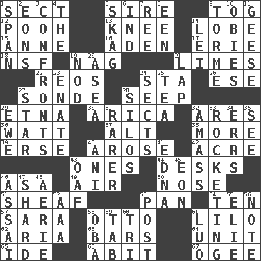 ACROSS 1. Religious group 5. Title for a man of rank and authority 9. Coat; cloak 12. "Silly old bear" 13. Leg joint 14. Ear part 15. Singer Murray 16. Arabian gulf 17. 4th largest of the Great Lakes 18. Overdraft (abbr.) 19. Tired old horse 21. Citrus fruits 22. Vintage cars 24. R.R. building 26. Compass dir. 27. Something which is sent 28. Ooze 29. Inactive volcano in Sicily 30. N. Chile seaport 32. Ancient Greek god of war 36. Electrical Unit 37. Keyboard modifier key 38. Greater amount 39. Celtic language 40. Came up 42. 1/640 square mile 43. Singles 44. Writing tables 46. White ___ sheet 49. Atmosphere 50. Olfactory organ 51. To gather and bind into a bundle 53. Baking dish 54. "___ Little Indians" 57. "Two Mules for Sister ____" 58. Von Bismarck 61. _ and Stitch 62. Operatic vocal solo 63. Taverns 64. A single undivided whole 65. Binary compound 66. "This won't hurt ____!" 67. Double curve, resembling the letter S DOWN 1. Connect, as a bridge 2. Immeasurably long periods of time 3. Meets 4. Definite Article 5. Heroin 6. Working for oneself (abbr.) 7. Portuguese money of account (variant) 8. Car or cant ending 9. Singer Mel 10. Off-Broadway awards 11. Honkers 14. Luau accessory 19. Lower and raise head in agreement 20. Toward the sea 21. Infant locale 23. Maternal 24. Religious groups 25. Afternoon social gathering 27. Play the lead 28. Grain storage towers 29. She-sheep 31. More valued for its uncommonness 32. Collect or gather 33. Shooting up abruptly 34. Blunders 35. Observe 40. Black tropical American cuckoo 41. Pulitzer Prize-winning author Ferber 43. Clumsy lout 45. A really long time 46. Slender Brazilian palm 47. Broken piece 48. Nest on high 52. American Automobile Association (abbr.) 53. Mail 55. Writer Wiesel 56. Observe 58. Chief or king in Benin or Nigeria 59. Keyboard key 60. Three (prefix) 61. Nilotic language