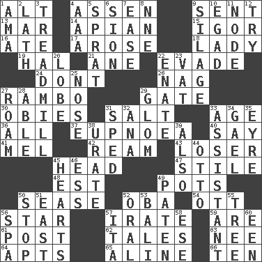 ACROSS 1. The first octave above the treble staff 4. NE Netherlands city 9. Posted 13. Make imperfect 14. Bee-related 15. Composer Stravinsky 16. Had dinner 17. Came up 18. Kenny Rogers chart-topper in '80 19. Actor Linden 21. One (Scot) 22. Dodge 24. Do not 26. Tired old horse 27. Role for Stallone 29. Yard entry 30. Off-Broadway awards 31. Table seasoning 33. Personal question 36. Everything 37. Normal relaxed breathing 40. Declare 41. Cartoonist voice _ Blanc 42. 480, 500 or 516 sheets of paper 43. Failure 45. Froth on beer 47. Vertical member of a panel or frame 48. Eastern Standard Time (abbr.) 49. Plant holders 50. Gospel singer Marvin 52. Chief or king in Benin or Nigeria 54. Baseball player Mel 56. Play the lead 57. Feeling or showing extreme anger 59. "We ___ not amused" (Victoria) 61. Mail 62. Falsehoods 63. Born 64. Tenement units (abbr.) 65. Place in a line 66. Nine, plus one DOWN 1. Nursemaid (var.) 2. Thin strip of wood or metal 3. Excercise machine 4. Auto club (abbr.) 5. Small fatty European fish 6. The Jewish people; Israel 7. Relaxation 8. Compass dir. 9. Fodder prepared in a silo 10. Mild oath 11. Thickened enlargement 12. Attempt to accomplish something 20. Ear part 22. Maternal 23. Large container 25. Characteristic smell of wine 27. Wander aimlessly 28. Competent 29. Seize upon or latch onto something 31. Hurried 32. Santa ___, CA 33. Helper 34. Highlander 35. Jane of fiction 38. A salt of uric acid 39. In addition 44. Von Bismarck 45. Centers 46. Curvy letter 49. Eucharist need 50. Cease 51. Compass direction 52. Spoken 53. Indonesian resort city 55. Woody plant 56. Health resort 57. Call ___ day 58. Compass dir. 60. Car or cant ending