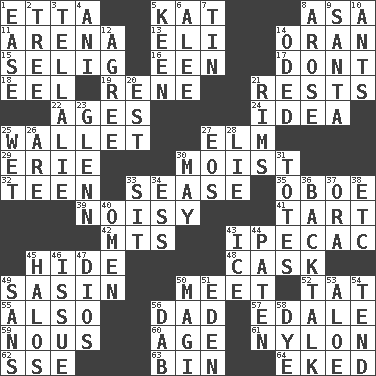ACROSS 1. Singer James 5. Krazy ___ of comics 8. White ___ sheet 11. Sports stadium 13. Biblical high priest 14. NW Algerian seaport 15. Former Milwaukee Brewers owner Bud 16. Car or cant ending 17. Do not 18. Snakelike fish 19. French philosopher Descartes 21. Musical pauses 22. Eras 24. It may be bright or harebrained 25. Place for singles 27. Shade tree 29. 4th largest of the Great Lakes 30. Damp 32. Adolescent 33. Gospel singer Marvin 35. Mitch Miller's instrument 39. Annoyingly loud 41. Small pie 42. Mountains (abbr.) 43. Medicinal drug used to evoke vomiting 45. Flintstone garb 48. Keg 49. Indian antelope 50. Rendezvous 52. Make lace 55. In addition 56. June honoree 57. Peak District village in England 59. Common sense 60. Mature 61. High-strength synthetic material 62. Compass dir. 63. Storage container 64. Made supply last DOWN 1. Relaxation 2. Woody plant 3. Copy Pinocchio 4. Black tropical American cuckoo 5. Peachy ____! 6. Toward shelter 7. Metal container 8. Came up 9. Before Barbara or Clara 10. Pismires 12. Match 14. Wrote a lyric poem 20. Eastern Standard Time (abbr.) 21. Basketball hoops 23. American astronaut and politician John 25. Soggy 26. "We ___ not amused" (Victoria) 27. Greek goddess of the dawn 28. Whopper 30. Can I? 31. Hauls 33. Be seated 34. Curvy letter 36. Sass 37. Mouth or opening 38. And so on (abbr.) 40. Sign of things to come 43. Frozen water 44. Eucharist need 45. Rings 46. Come out of 47. "Vaya con ____" 49. Without 50. Wise men 51. Paradise 53. Medicinal plant 54. Watch over 56. Small moist lump or mass 58. Color