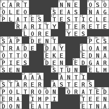 ACROSS 1. Haul 5. Compass dir. 8. Bear (Spanish) 11. Margarine 12. Oceans 13. Tired old horse 14. Food holders 17. One of the two male reproductive glands 19. Noteworthy scarcity 21. Cigar-shaped 22. Old wives' tales, e.g. 23. Affirmative reply 24. Plant excrement 27. Gouge 29. Personal Computers (abbr.) 32. Barter 34. 24 hours 36. Rich soil 37. Von Bismarck 38. Supplement with great effort 39. Pulitzer Prize-winning author Ferber 40. Sliced desserts 41. Lair 42. _ Allan Poe 43. Elected rep. 44. Astound 46. Shade tree 47. American Automobile Association (abbr.) 50. Opposed to 52. A viewer who gazes fixedly 55. Michaelmas daisies 57. Coward 59. Declaimed 62. Period 63. Body of Kaffir warriors 64. Adolescent 65. Spanish title 66. Ingest 67. Inactive volcano in Sicily DOWN 1. Police officer (slang) 2. 100% 3. Hitchcock's "____ Window" 4. "_____ Recall" 5. Born 6. Characterized by obscenity 7. First name in cosmetics 8. Single time 9. Table seasoning 10. Double curve, resembling the letter S 12. Filthy place 15. Wear away 16. Beget 18. Big collection agency 20. Looked after 24. Ceases 25. Nick name for Arthur 26. Eucharist need 28. Proceeds 29. Porridge 30. Lessep's creation 31. Excessive but superficial compliments 33. Two (Sp.) 35. Gossips 36. Directed 42. Keyboard key 45. To (old English) 47. Tate display 48. Nest on high 49. Odor 51. Feeling or showing extreme anger 52. Broke a traffic law 53. "Corrida" creature 54. Actor Alda or Thicke 55. Black tropical American cuckoo 56. Proofreading order 58. Elect 60. Car or cant ending 61. Heredity factor (abbr.)