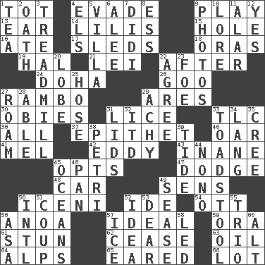 ACROSS 1. Small child 4. Dodge 9. Live dramatic performance 13. Hearing organ 14. Ms. Damita and namesakes 15. Hollow 16. Had dinner 17. Bobsleighs 18. Mouths or openings 19. Actor Linden 21. Flowery wreath 22. Following 24. Capital of the state of Qatar 26. Thick or sticky substance 27. Role for Stallone 29. Ancient Greek god of war 30. Off-Broadway awards 31. Louse (plural) 33. Affectionate concern, for short 36. Everything 37. Curse 40. Rowing implement 41. Cartoonist voice _ Blanc 42. Whirlpool 43. Lacking in sense or substance 45. Elects 47. Evade 48. Auto 49. Elected reps. 50. Ancient Celtic tribe of eastern Britain 52. Binary compound 54. Baseball player Mel 56. Small Philippine buffalo 57. Perfect 59. Mouth or opening 61. Astound 62. Stop 63. Petroleum 64. High mountains 65. Having ears or earlike features 66. Car dealer's back yard DOWN 1. Afternoon social gathering 2. Pledge 3. Excercise machine 4. Raised railways 5. Country residence 6. Toward shelter 7. "You Light Up My Life" star Conn 8. Curvy letter 9. Pictures 10. Old wives' tales, e.g. 11. Having or resembling wings 12. Consenting reply 20. Ear part 22. Match 23. Enemy 25. Flexible conduit 27. Wander 28. Competent 29. Painful 31. Flaplike coverings 32. It would 33. Inedible or poisonous agaric 34. Austrian-born American filmmaker Fritz 35. Algonquian 38. _ dish (used to culture cells) 39. Periodic rise and fall of the sea level 44. Words to Nanette 45. Seas 46. Baking dish 49. Gospel singer Marvin 50. International (abbr.) 51. Overturn; upset 52. The main thing one is thinking about 53. Letter starter 55. Musical group of three 56. White ___ sheet 57. Frozen water 58. Directed 60. The first octave above the treble staff