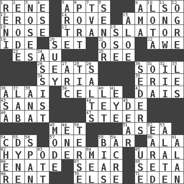 ACROSS 1. French philosopher Descartes 5. Flats, for short 9. In addition 13. Greek god of love 14. Be footloose 15. Amid 16. Sense of smell 17. Interpreter 19. Binary compound 20. Arrange properly for use 21. Bear (Spanish) 22. Deep reverence 23. He sold his birthright 25. Portuguese money of account (variant) 26. Theater features 30. Land 34. Damascus' land 35. 4th largest of the Great Lakes 36. Mountain range southwest of Kyrgyzstan 39. Cell (Danish) 42. Raised platform 43. Without 44. Miss Universe 1986, Barbara Palacios _ 46. Blind as ____ 47. Bull 48. Was introduced to 51. At sea 54. Music discs 57. Single 58. Drinking establishment 60. Wing 62. Under the skin 65. Mountain range 66. Maternal 67. Dry up 68. Bristle 69. Monthly bill 70. Otherwise 71. Genesis locale DOWN 1. Painter Guido (1575-1642) 2. Eat (away) 3. Olfactory organs 4. Compass dir. 5. Johnson of "Laugh-In" 6. Sweet dark-red dessert wine 7. Federal power corp. 8. Sir (Sp.) 9. Wet nurse (var.) 10. Globular water bottle used in Asia 11. Frozen precipitation 12. Legendary monster 15. Medicinal plant 18. Compass dir. 20. Chop _ 24. Aid 27. Curve 28. Neckwear 29. Table seasonings 30. Spring feasts 31. Mouth or opening 32. One more than two 33. French article 36. White ___ sheet 37. Experiment locale 38. Santa ___, CA 40. Allow 41. Sight organ 45. Letter starter 48. Method 49. Compass dir. 50. Laconic 52. Having ears or earlike features 53. Having winglike extensions 54. "Mermaids" star 55. Unit of force 56. Connect, as a bridge 58. Prejudice 59. Measure of real estate 61. Actor Alda or Thicke 63. Baseball player Mel 64. Cartoonist voice _ Blanc 65. Purpose