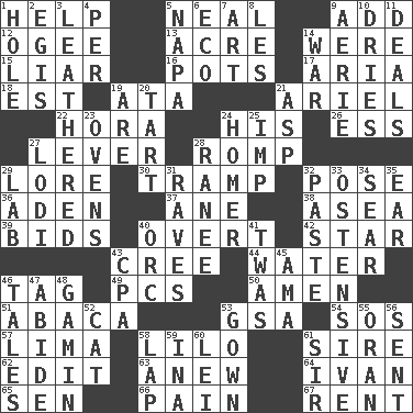 ACROSS 1. Aid 5. Be tempered by heat 9. Say or write further 12. Double curve, resembling the letter S 13. Land measure 14. Past tense of be (plural) 15. One who doesn't tell the truth 16. Cooking vessels 17. Roberta Peters solo 18. Eastern Standard Time (abbr.) 19. _ moment's notice (2 wds.) 21. Satellite of Uranus 22. Israeli folk dance 24. Part of HMS, perhaps 26. Double-curved letter 27. Prying instrument 28. Play 29. Old wives' tales, e.g. 30. _____ steamer (cargo ship) 32. Airs 36. Arabian gulf 37. One (Scot) 38. Toward the sea 39. Auction offers 40. Unconcealed 42. Play the lead 43. Algonquian 44. Wetness 46. Label 49. Personal Computers (abbr.) 50. So be it 51. Phillipine bananalike plant 53. Girls' org. (abbr.) 54. Mayday 57. Pale green bean 58. _ and Stitch 61. The founder of a family 62. Prepare for publication 63. Afresh 64. _ the terrible 65. Elected rep. 66. Ache 67. Monthly bill DOWN 1. Hollow 2. Armor plate that protects the chest 3. Resembling or made to resemble leather 4. For each 5. California wine valley 6. Environmental prefix 7. Nonscientific branch of learning 8. French article 9. Nest on high 10. Frees from moisture 11. Allots cards 14. Armed conflict 19. "We ___ not amused" (Victoria) 20. Small pie 21. Cleo's killer 23. Baking chambers 24. Simpsons dad 25. Mischievous child 27. Farming town in central California 28. The wife of a rajah (variant) 29. Experiment locale 31. All-night dance parties 32. Thick mixture 33. Clearly or manifestly demonstrative 34. Shrivel 35. Hearing organ 40. The grampus (Milton) 41. It was, poetically 43. Numbers guy (abbr.) 45. Wet nurse (var.) 46. Falsehoods 47. Tolerate 48. Street urchin 52. Domesticated feline 53. Long dress 55. Northwest Algerian city 56. Emitted 58. Infant locale 59. _ tizzy (2 wds.) 60. Flowery wreath 61. Title for a knight