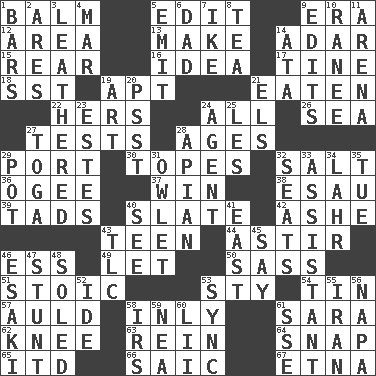 ACROSS 1. Lip ointment 5. Prepare for publication 9. Period 12. Length times width 13. Create 14. The sixth month of the Jewish calendar 15. Bring up, as a child 16. The content of cognition 17. Prong on a fork 18. Fast jet (abbr.) 19. Fitting 21. Eroded 22. Possessive pronoun 24. 100% 26. Ocean 27. Trials 28. Matures 29. Sweet dark-red dessert wine 30. Drinks excessively 32. Table seasoning 36. Double curve, resembling the letter S 37. Acquire through effort 38. Son of Isaac 39. Small amounts or degrees 40. Chalkboard 42. American tennis player Robert 43. Adolescent 44. Being in motion 46. Curvy letter 49. Allow 50. Backtalk 51. Unemotional 53. Filthy place 54. Shallow baking pan 57. Old (Scot.) 58. Inwardly 61. "Two Mules for Sister ____" 62. Leg joint 63. It's straight from the horse's mouth 64. Fastener 65. It would 66. Ketch in the Levant 67. Inactive volcano in Sicily DOWN 1. Taverns 2. Ancient Greek god of war 3. Tough but pliablecoriaceous 4. Spoil 5. Send forth 6. Male parent 7. D.D.E's nickname 8. Afternoon social gathering 9. Prepares for publication 10. The wife of a rajah (variant) 11. Sports stadium 14. _ moment's notice (2 wds.) 19. Nonscientific branch of learning 20. Inconspicuous attention getter 21. Raised railways 23. _____ Park, CO 24. Representative 25. French article 27. Ancient Roman robe 28. Bee-related 29. Plant holder 31. A small or young owl 32. Theater features 33. Helper 34. Cowardly lion portrayer 35. Third day of the wk. 40. Observe 41. Compass direction 43. Affectionate concern, for short 45. Declare 46. 1973 Nobel Price Winner (Physics) Leo 47. Check the growth or development of 48. Having a sole or soles 52. Binary compound 53. Synchronize (abbr.) 55. SW Asia republic 56. California wine valley 58. Big collection agency 59. Teachers' org. 60. Cards in a Roman deck? 61. Compass dir.