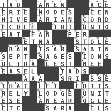 ACROSS 1. Small amount or degree 4. Afresh 8. Adept person 11. One of the Great Lakes 13. Methods 15. Car or cant ending 16. Hub of activity 17. Believer in; advocate of (suffix) 18. Drawstring 19. Learning spot: Fr. 21. Three (prefix) 22. To (old English) 23. Erode 24. Air blower 27. For each 29. Inactive volcano in Sicily 30. Fur scarf 34. Prohibit 36. Russian ruler of old 39. Unit of acoustic absorption 40. Back-to-school mo. 41. Gurus 43. Charged atoms 44. Extremist 46. For fear that 47. Born 48. Artist's stand 49. Small amounts or degrees 51. Auto club (abbr.) 53. Indian title of respect (Mr.) 54. Compass dir. 57. Not this but _ 60. Flowery wreath 63. Proofreads 65. Trust 66. Cabin 69. A single undivided whole 70. Compass dir. 71. Approach 72. Stare at amorously 73. And so on (abbr.) 74. "Two Mules for Sister ____" 75. Raised railways DOWN 1. Giggle 2. N. Chile seaport 3. A piece of turf (Scot.) 4. Wet nurse (var.) 5. And not 6. Prepare for publication 7. Put on (as clothing) 8. Period of immesurable duration 9. Sure thing 10. Inside; within (prefix) 12. Snakelike fish 14. Sever or remove by pinching or nipping 18. Window treatments 20. Bank Draft (abbr.) 25. Pismires 26. Rhinal 28. Curvy letter 29. Plea 31. Mitch Miller's instrument 32. Actor's bit 33. Followers of ems 34. Actor Lugosi 35. Tenement units (abbr.) 37. Mature 38. Musical pauses 40. Take to court 42. Play the lead 45. Chicken ___ king 50. Pass on 52. Silent film actress Nazimova 54. Burn superficially 55. Not moving 56. _____ Park, CO 57. Relationship diagram 58. Behest 59. Actor Baldwin 61. Immeasurably long periods of time 62. The main thing one is thinking about 64. Superhero pair 67. Slender fish 68. Period