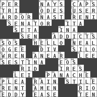 ACROSS 1. For each 4. Negative votes 8. Smile enhancers 12. Three (prefix) 13. Lyric poems 14. One who makes use of a thing 15. Zeal 18. Political cartoonist Thomas 19. Painter Guido (1575-1642) 20. Elected representative 22. Call ___ day 23. Bristle 24. _ tizzy (2 wds.) 25. Elected rep. 26. Inveterate users 30. Mayday 33. Phone greeting 36. Be tempered by heat 37. Double curve, resembling the letter S 39. HTML Container Element 40. Grain storage tower 41. Songbird 42. Approach 44. Area sheltered from the wind 45. French poetic form 47. Greek goddess of the dawn 50. To free from 51. Angers 53. Flowery wreath 54. Flamboyance 57. Entreaty 59. Water falling in drops from the sky 61. Vertical member of a panel or frame 63. Monthly bill 64. So be it 65. _ de Janeiro 66. Whirlpool 67. Comfort 68. Nine, plus one DOWN 1. Parent Teacher Assoc. 2. Blunders 3. Amusement-park features 4. Words to Nanette 5. The sixth month of the Jewish calendar 6. It is so 7. Fast jet (abbr.) 8. Window treatments 9. Toward the sea 10. Writing instrument 11. Indian title of respect (Mr.) 16. Washington bills 17. Pace 21. Hyperbolic tangent 22. Indiana (abbr.) 24. Wedding promise 26. Inventor's middle name 27. To provide with a ceiling 28. Falsehood 29. A type of plum 30. Sty mamas 31. Legendary monster 32. Observes 34. Pulitzer Prize-winning author Ferber 35. Whopper 38. Plea 42. Also 43. It's straight from the horse's mouth 46. One more than two 48. Mouths or openings 49. Religious group 52. Upper-body garment 53. Grant temporary use of 54. Sliced desserts 55. Queen of England 1702-14 56. Writer Wiesel 57. Before (prefix) 58. Directed 59. Actress Charlotte 60. Housemaid (var.) 62. Period of immesurable duration