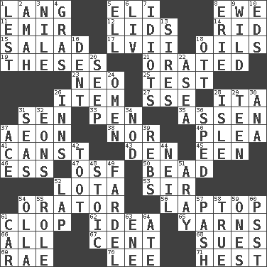 ACROSS 1. Austrian-born American filmmaker Fritz 5. Connecticut Ivy Leaguer 8. She-sheep 11. Independent ruler or chieftain 12. Flaplike coverings 14. To free from 15. Vegetable dish 17. 57 in ancient Rome 18. Petroleums 19. College papers 21. Spoke pompously 23. Modern: prefix 25. Trial 26. A distinct part 27. Compass dir. 28. Call ___ day 31. Elected rep. 33. Writing instrument 35. NE Netherlands city 37. A really long time 38. And not 40. Entreaty 41. 2nd pers. sing. pres. of can (arch.) 43. Lair 45. Car or cant ending 46. Double-curved letter 47. Order of Saint Francis (abbr.) 50. Necklace unit 52. Globular water bottle used in Asia 53. Title for a knight 54. Speaker 56. Portable computer 61. Hoof sound 62. It may be bright or harebrained 65. Entertaining tales 66. 100% 67. Penny 68. Institutes legal proceedings 69. Actress Charlotte 70. Area sheltered from the wind 71. Command DOWN 1. For fear that 2. Nanny 3. The longest river in the world 4. Pate de foie ____ 5. Pipe bend 6. 54 in ancient Rome 7. Foolish or stupid persons 8. 4th largest of the Great Lakes 9. Uncontrolled 10. Begley and Asner 13. Begets 16. Gouge 18. Baseball player Mel 20. Ooze 22. At sea 24. Sign of things to come 26. Restaurants 28. Capri or Wight 29. Adolescent 30. Santa ___, CA 31. Oceans 32. Immeasurably long periods of time 34. Dreamland 36. Hurried 37. Adept person 39. Confederate soldiers (slang) 42. A blast of a horn 44. Famous astronaut Armstrong 48. Unemotional 49. Pack 51. Like ___ of sunshine 52. Pet locale 54. Rounded earthenware pot or jar 55. Hero or heavy, e.g. 57. Romantic infatuation 58. Loyal 59. Washington bills 60. Inconspicuous attention getter 61. Automobile 63. Compass dir. 64. Had dinner
