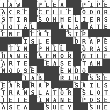 ACROSS 1. The 23rd letter of the Hebrew alphabet 4. Entreaty 8. Corncob 12. 43,560 square feet 14. Cell (Danish) 16. Aroma 17. Commotion 18. Wine waiters 20. "_____ Recall" 22. Wing 23. Had dinner 24. Compass dir. 25. Consume 28. Small drink 30. Small island 31. Window treatment 35. Shallow baking pan 37. Silvers or Donahue 40. Mouths or openings 41. Mild oath, euphamism for damn 42. Sir (Sp.) 44. Mediterranean tributary 45. Johnson of "Laugh-In" 46. Relaxation 47. Scottish cap 48. Trap for birds or small mammals 50. Inside; within (prefix) 52. Bar bill 54. _ de Janeiro 55. Compass dir. 58. Hearing organ 61. Strike 63. Travels by water 65. Interpreter 70. Narrow opening 71. False hair 72. Silly 73. Airs 74. At sea 75. Chop _ 76. A female animal or person DOWN 1. Clothes sense 2. 13-14th century defensive garment 3. Compose 4. Personal Computers (abbr.) 5. Lion 6. Shade tree 7. _ mater 8. Luau course 9. The content of cognition 10. Sweet dark-red dessert wine 11. Celtic language 13. Period 15. Snakelike fish 19. Put down 21. French article 26. High mountains 27. Giggle 29. Right away 30. Swallow 32. Roberta Peters solo 33. Inside of hand 34. Compass dir. 35. Pacific island yam 36. To the inside or interior of 38. _ tizzy (2 wds.) 39. Failure 41. Daniel's nick name 43. Painter Guido (1575-1642) 49. Hearing organs 51. Two (Sp.) 53. Indonesian resort city 55. Grain storage towers 56. Make a splashing sound 57. First name in cosmetics 58. Singer James 59. Ancient Greek god of war 60. Pace 62. Baking dishes 64. Cleo's killer 66. Teachers' org. 67. The 19th letter of the Greek alphabet 68. Single 69. Marina Del _, California