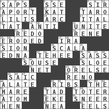 ACROSS 1. Plant excrements 5. Compass dir. 8. Title for a knight 11. To the left, to Queeg 13. Krazy ___ of comics 14. Edible starchy tuberous root 15. Ms. Damita and namesakes 16. Curve 17. Slanted text style (abbr.) 18. Make lace 19. Against 21. Join together 22. Make new 24. French philosopher Descartes 25. Eaten away 27. Lyricist Gershwin 29. The Jewish people; Israel 30. Any of the three canals of the cochlea 32. Pulitzer Prize-winning author Ferber 33. Giggle 35. Backtalk 39. Boozer 41. _ gin 42. Remaining after all deductions 43. Threatening words 45. Ketch in the Levant 48. Western Nevada city 49. Having winglike extensions 50. Teases 52. Definite Article 55. Female horse 56. Bit 57. Carrier 59. Tiny particle 60. Supplement with great effort 61. Contemptuous expression 62. Layer 63. Teachers' org. 64. Snakelike fish DOWN 1. Table seasoning 2. Capital of Western Samoa 3. Coward 4. Indian title of respect (Mr.) 5. Three-handed card game 6. Indian skirt 7. And so on (abbr.) 8. Smooth fabric 9. Feeling or showing extreme anger 10. Hero or heavy, e.g. 12. Sadhe (variant) 14. Prong on a fork 20. Lower and raise head in agreement 21. Mountain range 23. Ferber et al. 25. Compass dir. 26. To free from 27. Frozen water 28. Actress Charlotte 30. A female animal or person 31. NE Netherlands city 33. Third day of the wk. 34. Eastern Standard Time (abbr.) 36. One to whom something is allotted 37. Mayday 38. Perceive with the eye 40. Single time 43. Globe 44. Musical pauses 45. Schedule 46. Composer Copland 47. A distinct part 49. Wet nurse 50. Libertine 51. It may be bright or harebrained 53. Person who is morally reprehensible 54. Blunders 56. "___ Little Indians" 58. Single