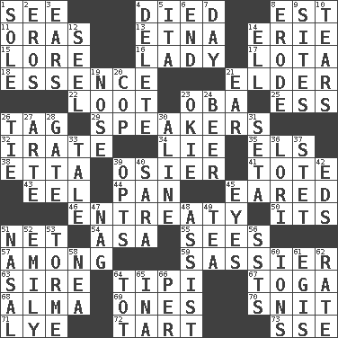 ACROSS 1. Perceive with the eye 4. Passed on 8. Eastern Standard Time (abbr.) 11. Mouths or openings 13. Inactive volcano in Sicily 14. One of the Great Lakes 15. Old wives' tales, e.g. 16. Kenny Rogers chart-topper in '80 17. Globular water bottle used in Asia 18. Center 21. A person who is older than you are 22. Spoils 23. Chief or king in Benin or Nigeria 25. Curvy letter 26. Label 29. Orators 32. Feeling or showing extreme anger 34. Untruth 35. Raised railways 38. Singer James 39. Flexible twig of a willow tree 41. Carry 43. Snakelike fish 44. Baking dish 45. Having ears or earlike features 46. Plea 50. ___ a Wonderful Life 51. Remaining after all deductions 54. White ___ sheet 55. Observes 57. Amid 59. More impudent 63. The founder of a family 64. Native american tent (variation) 67. Ancient Roman robe 68. _ mater 69. Washington bills 70. In a ____ (agitated or irritated) 71. Potassium hydroxide 72. Small pie 73. Compass dir. DOWN 1. Not divided or shared with others 2. Greek god of love 3. Hearing organs 4. Keyboard key 5. Call ___ day 6. Conclusion 7. 24 hours 8. Wear away 9. Settings 10. Rends 12. Stitch closed the eyes of (a falcon) 14. Pipe bend 19. Olfactory organ 20. Police officer (slang) 21. Ewer handle 23. Migrant worker of the '30s 24. Fermented drink made from hops 26. Make a knot 27. Johnson of "Laugh-In" 28. Yard entry 30. Place in a line 31. Bristle 33. Lie 36. Australian parrot (variant) 37. Proofreading order 39. Elects 40. "Two Mules for Sister ____" 42. Begley and Asner 45. Sight organs 47. Tired old horse 48. Help 49. Beverage made from leaves 51. Relating to the nose 52. Poet Dickinson 53. Singer Mel 56. Fast planes 58. Teachers' org. 60. Charged atoms 61. Armor plate that protects the chest 62. Assign a rank or rating to 64. Small child 65. _ tizzy (2 wds.) 66. For each