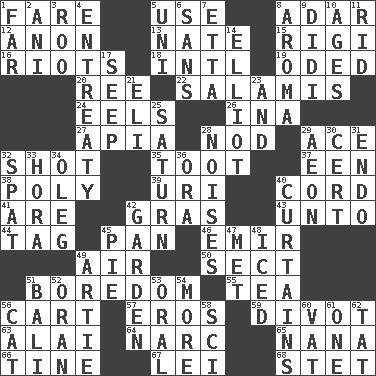 ACROSS 1. Conductor's collection 5. Purpose 8. The sixth month of the Jewish calendar 12. Soon (poet.) 13. Nathan's nickname 15. Swiss mountan, "Queen of the Mountains" 16. Debaucheries 18. International (abbr.) 19. Wrote a lyric poem 20. To separate or throw off 22. Deli grouping 24. Snakelike fish 26. _ tizzy (2 wds.) 27. Capital of Western Samoa 28. Dreamland 29. Adept person 32. Attempt 35. A blast of a horn 37. Car or cant ending 38. More than one (prefix) 39. RI univ. 40. Drawstring 41. "We ___ not amused" (Victoria) 42. Pate de foie ____ 43. To (old English) 44. Label 45. Baking dish 46. Independent ruler or chieftain 49. Wind 50. Religious group 51. Mood resulting from idleness 55. Beverage made from leaves 56. Draw slowly or heavily 57. Greek god of love 59. A piece of turf (Scot.) 63. Mountain range southwest of Kyrgyzstan 64. Drug cop 65. Nanny 66. Prong on a fork 67. Luau accessory 68. Proofreading order DOWN 1. At a great distance 2. Black tropical American cuckoo 3. Friend of Pooh 4. Plea 5. University (slang) 6. Without 7. Singer James 8. Scent 9. "You Light Up My Life" star Conn 10. Eras 11. To free from 14. American author Paul (1891-1958) 17. Ooze 21. Biblical high priest 23. Added to 25. Titan orbits this 28. Annoying sounds 29. A really long time 30. Certainty 31. Inside; within (prefix) 32. Argument over a trivial matter 33. Israeli folk dance 34. Cassini of fashion 36. Mouth or opening 40. Window treatments 42. Place where plants grow 45. Sliced dessert 47. Was introduced to 48. On the rocks 49. Nick name for Arthur 51. Indonesian resort city 52. NW Algerian seaport 53. Spoken 54. Greater amount 56. Feline 58. _-fi 60. Large container 61. Single 62. Make lace