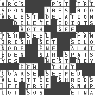 ACROSS 1. Curves 5. Pacific Standard Time (abbr.) 8. Three (prefix) 11. Within a short period 12. Angers 13. Friend of Pooh 14. Most capable 17. Accusation by an informer 19. Keyboard key 21. Foolish or stupid persons 22. Writer of Portnoy's Complaint (1969) 23. Turn to the right 24. For each 27. Sew up the eyelids of hawks and falcons 29. Avid follower 32. From or relating to Ireland 34. Put into a specified state 36. Grain storage tower 37. Thickened enlargement 38. Compass dir. 39. Mountain range southwest of Kyrgyzstan 40. Locale of original sin 41. Title for a knight 42. Arguments over trivial matters 43. It is so 44. A home for chicks 46. Marina Del _, California 47. Opposite of masc. 50. Not this but _ 52. Rough 55. Oozed 57. One to whom something is allotted 59. Tears up 62. Luau accessory 63. Celtic language 64. Fastener 65. Car dealer's back yard 66. Mayday 67. Inactive volcano in Sicily DOWN 1. White ___ sheet 2. Director Reiner 3. Having a low temperature 4. Scornful expression 5. Before (prefix) 6. Former Milwaukee Brewers owner Bud 7. Sadhe (variant) 8. Musical group of three 9. Carrot, for example 10. Charged atoms 12. Binary compound 15. Make a splashing sound 16. False hair 18. Standoff 20. College papers 24. Abounding in pines 25. Wear away 26. Amusement-park features 28. Soviet premier 1918-24 29. Of or pertaining to a thread or threads 30. Having winglike extensions 31. Annoyingly loud 33. Elected rep. 35. Cigar-shaped 36. Plant excrement 42. Staphylococcus 45. "______ My Girl" (Turtles hit) 47. Back 48. _____ Park, CO 49. Paris' subway 51. Laconic 52. Give a ring to 53. Margarine 54. Set down 55. Observe 56. Gouge 58. Double-curved letter 60. One of the 12 tribes of Israel 61. Health resort
