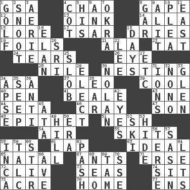 ACROSS 1. Girls' org. (abbr.) 4. US Secretary of Labor Elaine L. _ 8. Yawn 12. Single 13. Pig sound 14. Silent film actress Nazimova 15. Old wives' tales, e.g. 17. Russian ruler of old 18. Frees from moisture 19. Fencing necessities 21. Insect wing 23. Make lace 24. Rends 26. Sight organ 28. The longest river in the world 30. Nestling 34. White ___ sheet 37. Margarine 39. Calm and collected 40. Writing instrument 41. Memphis, Tenn. Street 43. Compass dir. 44. Stalk of a moss capsule 46. Supercomputer manufacturer 47. Male offspring 48. Curse 51. Tender 54. Wind 55. Burlesque acts 58. ___ a Wonderful Life 61. Infant locale 63. Perfect 65. Brizilian seaport 67. Pismires 71. Celtic language 72. 154 in Roman numerals 73. Oceans 74. Be seated 75. 1/640 square mile 76. Dwelling 77. Followers of ems DOWN 1. Eighteen holes 2. Snob 3. Nest on high 4. Small bed 5. Part of HMS, perhaps 6. Santa ___, CA 7. Gumbo ingredient 8. Slender fish 9. Set down 10. Entreaty 11. 90 degrees 16. Liveliness 18. 24-hour periods 20. Indian title of respect (Mr.) 22. Area sheltered from the wind 25. Oscar Madison type 27. And so on (abbr.) 29. Opt 30. Pitcher Ryan 31. Charged particles 32. Words to Nanette 33. Small, secluded valley 34. Domed church section 35. Ooze 36. Against 38. Ewer handle 42. Snake ____ (dice throw) 45. "One Day ___ Time" 49. Land elevation 50. Epoch 52. What Jean-Claude Killy likes to do 53. Flintstone garb 56. Laconic 57. Indian antelope 58. South American Indian 59. Baby powder 60. Use a spoon 62. Romantic infatuation 64. Allows 66. "___ Maria" 68. Modern: prefix 69. Scottish cap 70. Compass dir.