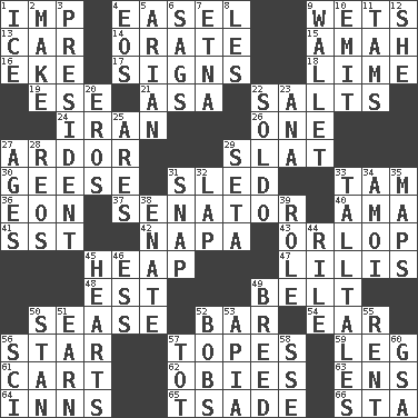 ACROSS 1. Mischievous child 4. Artist's stand 9. Soaks 13. Auto 14. Speak pompously 15. Nanny 16. Supplement with great effort 17. Signals 18. Citrus frut 19. Compass dir. 21. White ___ sheet 22. Table seasonings 24. SW Asia republic 26. Single 27. Zeal 29. Narrow board 30. Honkers 31. Downhill vehicle 33. Scottish cap 36. A really long time 37. Elected representative 40. Housemaid (var.) 41. Fast jet (abbr.) 42. California wine valley 43. Fourth or lowest deck 45. Pile 47. Ms. Damita and namesakes 48. Eastern Standard Time (abbr.) 49. Waist strap 50. Gospel singer Marvin 52. Soap unit 54. Hearing organ 56. Play the lead 57. Drinks excessively 59. Part of a journey 61. Heavy open wagon 62. Off-Broadway awards 63. Followers of ems 64. Lodging establishments 65. Sadhe (variant) 66. R.R. building DOWN 1. Frozen water 2. Create 3. Elected leader of a country 4. Greek goddess of the dawn 5. Believer in; advocate of (suffix) 6. Sinks 7. Inactive volcano in Sicily 8. French article 9. Place for singles 10. Send forth 11. Scottish caps 12. A female animal or person 20. Greek god of love 22. Twentieth part of a lira 23. Santa ___, CA 25. Ancient Greek god of war 27. Eras 28. Vintage cars 29. Bristle 31. Fastener 32. Pet locale 33. Baron Munchausen's specialties 34. Mine, in Marseilles 35. Atlas contents 38. Maternal 39. Hero or heavy, e.g. 44. Cause heat under the collar 45. Centers 46. Curvy letter 49. A special lineage 50. Comedian Laurel of Laurel & Hardy 51. Merit 52. Moves up and down 53. Capital of Western Samoa 55. Monthly bill 56. _-fi 57. Small child 58. Compass dir. 60. Girls' org. (abbr.)