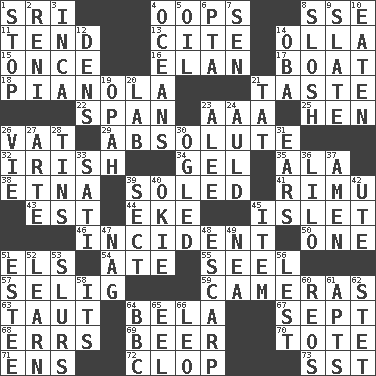 ACROSS 1. _ Lanka 4. I made a mistake 8. Compass dir. 11. Be inclined (to) 13. Quote 14. Water jar 15. Single time 16. Liveliness 17. Water vessel 18. Player piano 21. Clothes sense 22. Connect, as a bridge 23. American Automobile Association (abbr.) 25. Layer 26. Large container 29. Utter; complete 32. From or relating to Ireland 34. Set 35. Insect wing 38. Inactive volcano in Sicily 39. Having a sole or soles 41. Tall New Zealand timber tree 43. Eastern Standard Time (abbr.) 44. Supplement with great effort 45. Small island 46. Happening 50. Single 51. Raised railways 54. Had dinner 55. Stitch closed the eyes of (a falcon) 57. Major League Baseball Commissioner Bud 59. Devices for capturing images 63. Tense 64. Actor Lugosi 67. Back-to-school mo. 68. Blunders 69. Fermented drink made from hops 70. Carryall 71. Followers of ems 72. Hoof sound 73. Fast jet (abbr.) DOWN 1. Discontinue 2. Painter Guido (1575-1642) 3. South American Indian 4. Seas 5. Lubricate 6. Parent Teacher Association (abbr.) 7. Elected rep. 8. Agitate, as a liquid 9. Chalkboard 10. Eroded 12. Lairs 14. Chief or king in Benin or Nigeria 19. Brightly colored fish 20. Experiment locale 21. Make lace 23. Toward shelter 24. Old (Scot.) 26. Compete 27. Johnson of "Laugh-In" 28. Airtight sealed metal containers 30. Stared 31. Hearing organs 33. Suttee (variant) 36. _ and Stitch 37. So be it 39. Religious group 40. Migrant worker of the '30s 42. Shoshoni 45. Detail 47. Tired old horse 48. Fortification 49. Teachers' org. 51. First name in cosmetics 52. Memorize 53. Runs notes together 56. For fear that 58. It is 60. Vintage cars 61. Flats, for short 62. Proofreading order 64. English channel? 65. Snakelike fish 66. Lion