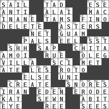 ACROSS 1. Move on water 5. Small amount or degree 8. Compass dir. 11. Opposed to 12. Jai ____ 14. Big _ 15. Empty; void 17. Scottish caps 18. Fine (Spanish) 19. Keyboard key 21. Michaelmas daisies 23. Fish or hair follower 25. Island territory of the United States 26. Friends 27. Snakelike fish 28. Fast jet (abbr.) 31. Quiet! 33. Plant excrement 35. Riviera of "Kiss of the Spider Woman" 37. Mine, in Marseilles 38. Sorrow 40. Cassini of fashion 41. Country estate 43. _-fi 45. Was introduced to 46. Had dinner 47. French article 50. Printing process, for short 52. Otherwise 53. University (slang) 54. Make 56. Sounds asleep 61. SW Asia republic 62. Genesis locale 65. Eat (away) 66. Krazy ___ of comics 67. Stitched 68. "This won't hurt ____!" 69. Sight organ 70. To separate or throw off 71. Observes DOWN 1. Expressed in words 2. Singer Murray 3. Slanted text style (abbr.) 4. Actor's bit 5. Make lace 6. Insect wing 7. Break 8. Independent ruler or chieftain 9. Without 10. Environmental prefix 13. Come out of 16. Inactive volcano in Sicily 18. Opposite of masc. 20. Snakelike fish 22. Baby powder 24. Russian ruler of old 26. Silvers or Donahue 28. Drop; flow; fall 29. Proofreading order 30. Label 31. Stricken, poetically 32. Hollow 34. Fluid product of inflammation 36. Same (prefix) 37. Actress Gardner 39. Shade of tan 42. Silent film actress Nazimova 44. Charged particles 48. _____ Park, CO 49. Sowing specialist 51. Prong on a fork 52. Car or cant ending 54. Supercomputer manufacturer 55. Assign a rank or rating to 57. Mouths or openings 58. Loose flowing garment 59. Singer Brickell 60. Puts into a specified state 61. Mamie's husband 63. She-sheep 64. Compass dir.