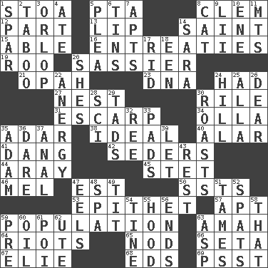ACROSS 1. Portico 5. Parent Teacher Assoc. 8. Clement's nick name 12. Piece 13. Mouth edge 14. Inhabitant of Heaven 15. Competent 16. Pleas 19. Friend of Pooh 20. More lively and spirited 21. Brightly colored fish 23. Heredity factor (abbr.) 24. Possessed 27. Egg locale 30. Cause heat under the collar 31. Fortification 34. Spanish pot 35. The sixth month of the Jewish calendar 38. Standard of perfection 40. Having or resembling wings 41. Mild oath, euphamism for damn 42. Spring feasts 44. Like ___ of sunshine 45. Proofreading order 46. Cartoonist voice _ Blanc 47. Eastern Standard Time (abbr.) 50. Fast planes 53. Curse 57. Fitting 59. Census information 63. Nanny 64. Debaucheries 65. Dreamland 66. Bristle 67. Writer Wiesel 68. Begley and Asner 69. Inconspicuous attention getter DOWN 1. Coast Guard woman 2. Off limits 3. Fourth or lowest deck 4. Had dinner 5. Entreaty 6. Metal containers 7. Flats, for short 8. Feline 9. Cards in a Roman deck? 10. Compass dir. 11. Mountains (abbr.) 14. "Two Mules for Sister ____" 17. To free from 18. Car or cant ending 20. "______ My Girl" (Turtles hit) 22. Disorder of the immune system 24. Land elevation 25. Silent film actress Nazimova 26. Letter starter 28. _-fi 29. Bits 30. Cooks with dry heat, as in an oven 32. To separate or throw off 33. Writing tablets 35. First man 36. Have the gumption 37. Of or related to the anus 39. Allow 43. State of inaction 47. Snakelike fish 48. Health resort 49. Teat (slang) 51. Softens 52. Arguments over trivial matters 54. Prong on a fork 55. Parka part 56. Conclusions 58. Not this but _ 59. Before (prefix) 60. Lubricate 61. Luau course 62. Shoshoni 63. Viper