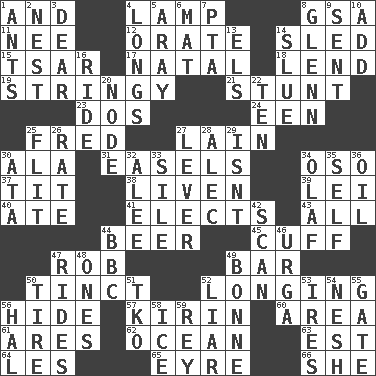 ACROSS 1. Also 4. Desk light 8. Girls' org. (abbr.) 11. Born 12. Declaim 14. Downhill vehicle 15. Russian ruler of old 17. Relating to or accompanying birth 18. Grant temporary use of 19. Slender, wiry 21. Check the growth or development of 23. Two (Sp.) 24. Car or cant ending 25. Flintstone 27. (Had) reclined 30. Chicken ___ king 31. Artist's stands 34. Bear (Spanish) 37. Teat (slang) 38. Make or become more lively 39. Flowery wreath 40. Had dinner 41. Opts 43. Everything 44. Fermented drink made from hops 45. _ links 47. Director Reiner 49. Long, evenly shaped piece 50. Tinged 52. Yearning 56. Flintstone garb 57. Japanese brewing company 60. Length times width 61. Ancient Greek god of war 62. Sea 63. Eastern Standard Time (abbr.) 64. French article 65. Jane of fiction 66. A female animal or person DOWN 1. Pismires 2. Egg locale 3. Letter starter 4. Yearns 5. Like ___ of sunshine 6. Floor protector 7. Parent Teacher Assoc. 8. American astronaut and politician John 9. Emitted 10. Find the sum of 13. Raised railways 14. Turn sharply 16. Travel on or in a vehicle 20. Connecting point 22. "___ Little Indians" 25. Sudden quick movement 26. Assign a rank or rating to 27. Crowbar 28. Actor Baldwin 29. Is not 30. _ moment's notice (2 wds.) 32. Toward shelter 33. Filth; sediment 34. Norwegian king 35. Automatically 36. Lubricate 42. Examine hastily 44. English channel? 46. Capital and largest city of Mongolia 47. Amusement-park features 48. Singles 49. Maid-servant 50. Become fatigued 51. Ring climax 52. One who doesn't tell the truth 53. Angers 54. Delicate 55. Yard entry 56. Actor Linden 58. Frozen water 59. Marina Del _, California