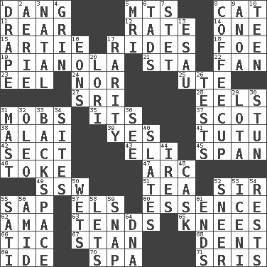 ACROSS 1. Mild oath, euphamism for damn 5. Mountains (abbr.) 8. Feline 11. Hitchcock's "____ Window" 12. Pace 14. Single 15. Nick name for Arthur 17. Amusement-park features 18. Enemy 19. Player piano 21. R.R. building 22. Avid follower 23. Snakelike fish 24. Not either 25. Shoshoni 27. Indian title of respect (Mr.) 28. Snakelike fish 31. Crowds into 35. It is 37. Highlander 38. Jai ____ 39. It is so 41. Ballerina skirt 42. Religious group 43. Biblical high priest 45. Connect, as a bridge 46. Puff or smoke 47. Curve 49. Compass dir. 51. Beverage made from leaves 52. Title for a knight 55. Plant excrement 57. Raised railways 60. Core 62. Housemaid (var.) 63. Watches over 65. Leg joints 66. Nervous spasm 67. Comedian Laurel of Laurel & Hardy 68. Gouge 69. Binary compound 70. Health resort 71. Indian titles of respect DOWN 1. Window treatment 2. Nest on high 3. Brizilian seaport 4. Smile widely 5. Medical imaging device (abbr.) 6. Bits 7. Proofreading order 8. Java holder (2 wds.) 9. Small Philippine buffalo 10. Adolescent 13. He sold his birthright 16. Immeasurably long periods of time 17. Noteworthy scarcity 20. Australian parrot (variant) 26. Trials 29. Globular water bottle used in Asia 30. Astound 31. Vertical spar for supporting sails 32. Margarine 33. Keyboard key 34. Settings 36. Observe 40. Chalkboards 44. Angers 48. Keg 50. Moistens 52. Contemptuous expression 53. Ancient Celtic tribe of eastern Britain 54. Musical pauses 55. Suttee (variant) 56. Among 58. Allows 59. Fastener 61. Conclusions 64. Heredity factor (abbr.)
