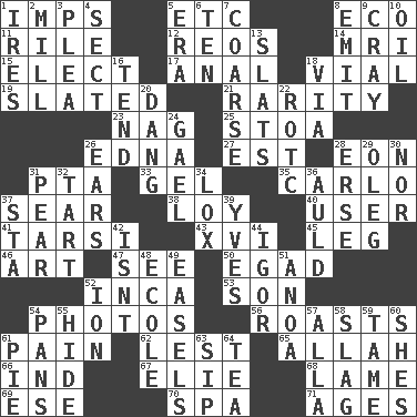 ACROSS 1. Naughty children 5. And so on (abbr.) 8. Environmental prefix 11. Cause heat under the collar 12. Vintage cars 14. Medical imaging device (abbr.) 15. Choose 17. Of or related to the anus 18. Small bottle 19. Scheduled 21. Noteworthy scarcity 23. Tired old horse 25. Portico 26. Pulitzer Prize-winning author Ferber 27. Eastern Standard Time (abbr.) 28. Period of immesurable duration 31. Parent Teacher Association (abbr.) 33. Set 35. Monte _, Las Vegas Hotel/Casino 37. Scorch 38. Myrna of the movies 40. One who uses or employs something 41. Tarsus (plural) 43. 16 45. Part of a journey 46. Tate display 47. Perceive with the eye 50. Mild oath 52. South American Indian 53. Manchild 54. Pictures 56. Ridicules or criticizes harshly 61. Ache 62. For fear that 65. Assad's deity 66. Working for oneself (abbr.) 67. Writer Wiesel 68. Unable to walk 69. Compass dir. 70. Health resort 71. Ripens DOWN 1. Angers 2. Place where flour is made 3. Entreaty 4. Religious group 5. Period 6. Nine, plus one 7. Rough 8. Send forth 9. Supercomputer manufacturer 10. Petroleum 13. Narrow boards 16. Be inclined (to) 18. By way of 20. Mild oath, euphamism for damn 22. College mil. group 24. Highlander 26. Hearing organs 28. Celtic language 29. Cassini of fashion 30. And not 31. Lightbulb-shaped fruit 32. Small pie 34. Brine-cured salmon 36. Old (Scot.) 37. R.R. building 39. Jacques Cousteau's middle name 42. Is not 44. Russian composer Stravinsky 48. Learning spot: Fr. 49. Artist's stands 51. Small Philippine buffalo 52. Electrically charged atom 54. Zero-star reviews 55. Flintstone garb 57. Silent film actress Nazimova 58. Volcanic refuse 59. Not wild 60. "______ My Girl" (Turtles hit) 61. Sliced dessert 63. Small drink 64. Afternoon social gathering