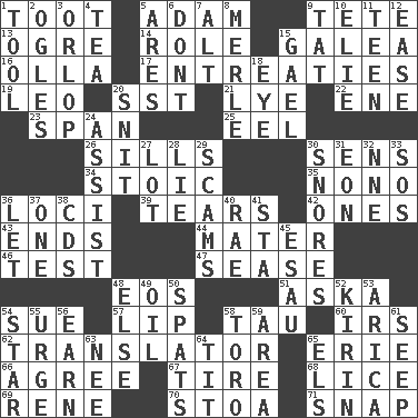 ACROSS 1. A blast of a horn 5. First man 9. False hair 13. Legendary monster 14. Hero or heavy, e.g. 15. An organ shaped like a helmet 16. Water jar 17. Pleas 19. Lion 20. Fast jet (abbr.) 21. Sodium hydroxide 22. Compass dir. 23. Connect, as a bridge 25. Snakelike fish 26. Beverly of Met fame 30. Elected reps. 34. Unemotional 35. Words to Nanette 36. Event scenes 39. Separates forcefully 42. Washington bills 43. Extremities 44. Mother 46. Trial 47. Gospel singer Marvin 48. Greek goddess of the dawn 51. "____ silly question..." 54. Institute legal proceedings 57. Mouth edge 58. The 19th letter of the Greek alphabet 60. Big collection agency 62. Interpreter 65. 4th largest of the Great Lakes 66. Match 67. Hoop that covers a wheel 68. Louse (plural) 69. French philosopher Descartes 70. Portico 71. Fastener DOWN 1. Implement 2. Stares 3. Fourth or lowest deck 4. Afternoon social gathering 5. Ancient Greek god of war 6. Do not 7. Keyboard modifier key 8. Haggard of country music 9. Make lace 10. Writer Wiesel 11. Adolescent 12. Comfort 15. Highlander 18. Sight organ 20. In a ____ (agitated or irritated) 24. Aid 27. Car dealer's back yard 28. Falsehood 29. Fraudulent business schemes 30. Sounds asleep 31. Period of immesurable duration 32. Compass dir. 33. Distress signal 36. Allow 37. Single 38. Music discs 40. Actress Charlotte 41. R.R. building 45. He sold his birthright 48. Otherwise 49. Lubricate 50. Arguments over trivial matters 52. Japanese brewing company 53. N. Chile seaport 54. Play the lead 55. Goad 56. Merit 58. "Corrida" creature 59. Length times width 61. Ooze 63. Born 64. Teat (slang) 65. Raised railways