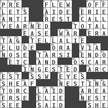 ACROSS 1. Before (prefix) 4. Soared 8. Not in operation 11. Allows 13. Assistant 14. 4th largest of the Great Lakes 15. Opposed to 16. Relief 17. Give a ring to 18. Had a strong desire 21. "_____ Recall" 22. Comfort 23. Armed conflict 25. Epoch 26. Label 29. Copy Pinocchio 32. Evade 34. Mouth or opening 35. By way of 38. Sense of smell 39. Tarsus (plural) 41. Inside; within (prefix) 43. And so on (abbr.) 44. Plus 45. Witty Wilde 46. Consumed 50. Curve 51. Eastern Standard Time (abbr.) 54. Compass dir. 55. Sight organs 57. Archer's quiver 59. Inhabiting a nest 63. Torque (variant) 64. Put down 67. Length times width 68. Celtic language 69. Writer Wiesel 70. Egg locale 71. Observe 72. Alleged 73. A female animal or person DOWN 1. Frolic 2. French philosopher Descartes 3. Singer James 4. Burden 5. Whopper 6. Begley and Asner 7. Dripping 8. Declaim 9. Having threads 10. Chap (slang) 12. Beget 14. Environmental prefix 19. Nathan's nickname 20. Compass dir. 21. Three (prefix) 23. Armed conflicts 24. Mountain range southwest of Kyrgyzstan 26. Nine, plus one 27. Medicinal plant 28. Abrupt rush of wind 30. Nobles 31. Nights before holidays 33. Tenth: prefix 36. South American Indian 37. The sixth month of the Jewish calendar 39. Labels 40. Afresh 42. The grampus (Milton) 45. Lyric poems 47. Science/research agcy. 48. Watched over 49. Sight organ 51. _____ Park, CO 52. Dinah or Pauly 53. Laconic 56. Comedian Laurel of Laurel & Hardy 58. Adept person 60. Angers 61. Tender 62. Yard entry 64. French article 65. According to 66. One more than two