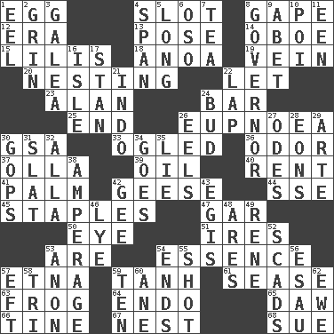 ACROSS 1. Oval reproductive body of a fowl 4. Slit 8. Open wide 12. Epoch 13. Airs 14. Mitch Miller's instrument 15. Ms. Damita and namesakes 18. Small Philippine buffalo 19. Distinctive style or manner 20. Nestling 22. Allow 23. Actor Alda or Thicke 24. Soap unit 25. Conclude 26. Normal relaxed breathing 30. Girls' org. (abbr.) 33. Stared at amorously 36. Scent 37. Spanish pot 39. Lubricate 40. Monthly bill 41. Inside of hand 42. Honkers 44. Compass dir. 45. Paper fasteners 47. Slender fish 50. Sight organ 51. Angers 53. "We ___ not amused" (Victoria) 54. Center 57. Inactive volcano in Sicily 59. Hyperbolic tangent 61. Gospel singer Marvin 63. Toadlike animal 64. Inside; within (prefix) 65. Fool 66. Prong on a fork 67. A home for chicks 68. Take to court DOWN 1. Snakelike fish 2. Amused look 3. An organ shaped like a helmet 4. Connect, as a bridge 5. Protracted 6. Bear (Spanish) 7. Beverage made from leaves 8. Head of state? 9. Collude with 10. Luau course 11. Car or cant ending 16. Small island 17. Comedian Laurel of Laurel & Hardy 21. Southeast Asian peninsula 22. Pet locale 24. Partially opened flower 26. Snakelike fish 27. Lyric poems 28. Immeasurably long periods of time 29. Johnson of "Laugh-In" 30. Republicans 31. Narrow board 32. Silent film actress Nazimova 34. Leaves 35. Untruth 38. Electrical Measurement 42. Turn to the right 43. Armor plate that protects the chest 46. Potassium hydroxide 48. Ancient Greek god of war 49. French philosopher Descartes 52. Heaps 53. Soon (poet.) 54. Conclusions 55. Attempt 56. Son of Isaac 57. Lizard (obsolete) 58. Three (prefix) 59. Nine, plus one 60. One (Scot) 62. She-sheep