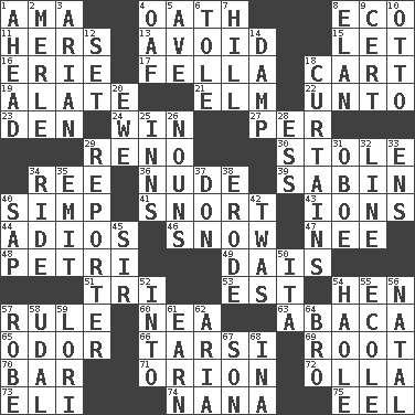 ACROSS 1. Nanny (var.) 4. Pledge 8. Environmental prefix 11. Possessive pronoun 13. Keep away from 15. Allow 16. 4th largest of the Great Lakes 17. Chap (slang) 18. Haul 19. Having winglike extensions 21. Shade tree 22. To (old English) 23. Lair 24. Victory 27. For each 29. Western Nevada city 30. Took without asking 34. To riddle 36. Unadorned 39. Unit of acoustic absorption 40. Simple or foolish person 41. Derisive sound 43. Charged particles 44. Goodbye (Sp.) 46. Overwhelm 47. Born 48. _ dish (used to culture cells) 49. Raised platform 51. Three (prefix) 53. Eastern Standard Time (abbr.) 54. Layer 57. Court order 60. Teachers' org. 63. Phillipine bananalike plant 65. Aroma 66. Tarsus (plural) 69. Carrot, for example 70. Drinking establishment 71. Constellation of myth 72. Rounded earthenware pot or jar 73. Biblical high priest 74. Grandmother 75. Snakelike fish DOWN 1. Toward the future 2. Haggard of country music 3. Believer in; advocate of (suffix) 4. Clumsy lout 5. "___ Maria" 6. Lacquered or enameled metalware 7. Land elevation 8. Enthusiasm 9. Sure thing 10. "Beetle Bailey" pooch 12. Arrange properly for use 14. Moist 18. Window treatments 20. She-sheep 25. Taverns 26. Parts of speech 28. Double-curved letter 29. News announcer 31. Mitch Miller's instrument 32. Actor's bit 33. Followers of ems 34. Travel on an animal 35. Send forth 37. Spanish title 38. Wear away 40. Plant excrement 42. It was, poetically 45. Title for a knight 50. Call ___ day 52. To the inside or interior of 54. White Person, in Hawaii 55. Learning spot: Fr. 56. Relating to or accompanying birth 57. Loose flowing garment 58. Hereditary estate 59. Australian parrot (variant) 61. Merit 62. Roberta Peters solo 64. Sis' sibling 67. Male offspring 68. _ tizzy (2 wds.)