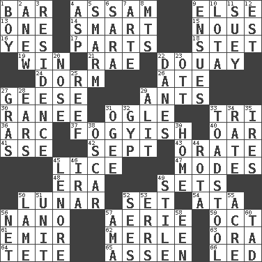 ACROSS 1. Soap unit 4. Indian state 9. Otherwise 13. Single 14. Don Adams' spy role 15. Horse sense 16. Consenting reply 17. Actors' quests 18. Proofreading order 19. Acquire through effort 21. Actress Charlotte 22. A city in N France, SE of Calais 24. Dormintory (informal) 26. Had dinner 27. Honkers 29. Pismires 30. Indian princess (variant) 31. Stare at amorously 33. Three (prefix) 36. Curve 37. Out of fashion; old fashioned 40. Boat paddle 41. Compass dir. 42. Back-to-school mo. 43. Speak pompously 45. Louse (plural) 47. Methods 48. Epoch 49. Puts into a specified state 50. Type of eclipse 52. Put into a specified state 54. _ moment's notice (2 wds.) 56. Billionth: prefix 57. Nest on high 59. Sep. follower 61. Arab leader 62. Haggard of country music 63. Mouth or opening 64. False hair 65. NE Netherlands city 66. Directed DOWN 1. Male child 2. Afresh 3. Home 4. Cleo's killer 5. Excessive but superficial compliments 6. "Two Mules for Sister ____" 7. Johnson of "Laugh-In" 8. Mountains (abbr.) 9. Follows as a consequence or result 10. Globular water bottle used in Asia 11. Chop _ 12. Eastern Standard Time (abbr.) 20. Characteristic smell of wine 22. Natives or inhabitants of Denmark 23. Baseball player Mel 25. Coral ridge 27. Pate de foie ____ 28. Hearing organs 29. Set down 31. Double curve, resembling the letter S 32. Hustle 33. Inedible or poisonous agaric 34. Pace 35. Angers 38. Witty Wilde 39. Residence 44. Roll call or roster of names 45. Poe poem 46. Retirement account (abbr.) 49. Vertical member of a panel or frame 50. Unable to walk 51. A single undivided whole 52. Perceives with the eye 53. Blunders 55. Measure of real estate 56. Remaining after all deductions 57. Nursemaid (var.) 58. Car or cant ending 60. Small boy