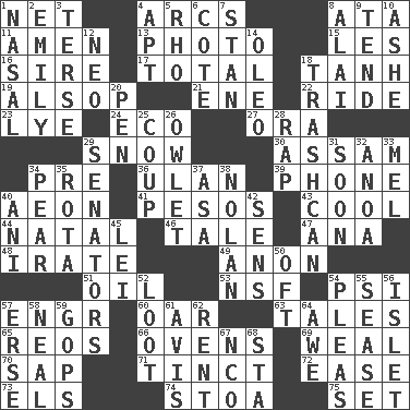ACROSS 1. Fish or hair follower 4. Curves 8. "One Day ___ Time" 11. So be it 13. Picture 15. French article 16. Male parent of an animal 17. Add up to 18. Hyperbolic tangent 19. Columnist Joseph or Stewart 21. Compass dir. 22. Travel on or in a vehicle 23. Sodium hydroxide 24. Environmental prefix 27. Mouth or opening 29. Frozen precipitation 30. Indian state 34. Before (prefix) 36. Uhlan (variant) 39. Give a jingle 40. A really long time 41. Mexican monetary units 43. Calm and collected 44. Relating to or accompanying birth 46. Falsehood 47. Santa ___, CA 48. Feeling or showing extreme anger 49. At once, immediately (arch.) 51. Lubricate 53. Overdraft (abbr.) 54. Air pressure measure (abbr.) 57. Engineer (abbr.) 60. Boat paddle 63. Lies 65. Vintage cars 66. Baking chambers 69. Welt 70. Plant excrement 71. A color or tint 72. Relaxation 73. Raised railways 74. Portico 75. Arrange properly for use DOWN 1. Rhinal 2. Poet Dickinson 3. Laconic 4. Fitting 5. 17th letter of the Greek alphabet 6. ____ d'Azur (French Riviera) 7. Comedian Laurel of Laurel & Hardy 8. Mountain range southwest of Kyrgyzstan 9. Watch over 10. American tennis player Robert 12. Modern: prefix 14. Margarine 18. File 13 20. Animal enclosure 25. Overturn; upset 26. A small or young owl 28. Hit sharply and swiftly 29. Elected representatives 31. Within a short period 32. Small Philippine buffalo 33. Cartoonist voice _ Blanc 34. Lightbulb-shaped fruit 35. Roll call or roster of names 37. White ___ sheet 38. Pitcher Ryan 40. Cuckoo 42. Elected reps. 45. Luau accessory 50. Often (poetically) 52. Plunder 54. Entreaties 55. Gospel singer Marvin 56. Small island 57. Celtic language 58. Anneal 59. Republicans 61. Deliberation 62. Monthly bill 64. Deep reverence 67. Non-commissioned officer (abbr.) 68. R.R. building