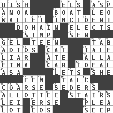 ACROSS 1. Food container 5. Raised railways 8. Viper 11. Small Philippine buffalo 12. Water vessel 13. Lion 14. Place for singles 17. Event 19. Realm 21. Chooses 22. Simple or foolish person 23. Elected rep. 24. Set 27. Adolescent 29. Keyboard key 32. Goodbye (Sp.) 34. Feline 36. Falsehood 37. One who doesn't tell the truth 38. Had dinner 39. Silent film actress Nazimova 40. Inactive volcano in Sicily 41. Automobile 42. Standard of perfection 43. White ___ sheet 44. Allows 46. A female animal or person 47. Opposite of masc. 50. Baby powder 52. Rough 55. Spring feasts 57. One to whom something is allotted 59. Flight of steps 62. Flowery wreath 63. Celtic language 64. Entreaty 65. Car dealer's back yard 66. Greek goddess of the dawn 67. Ooze DOWN 1. Obsolete 2. _ tizzy (2 wds.) 3. Disposed of to a purchaser 4. Radiant circles of light 5. Period of immesurable duration 6. Shoestrings 7. Vertical member of a panel or frame 8. Actor Baldwin 9. Transmitted 10. Plant holders 12. Storage container 15. Gives off 16. Not wild 18. Lair 20. Medicinal drug used to evoke vomiting 24. An organ shaped like a helmet 25. Proofreads 26. Climbing, woody, usually tropical vines 28. Relating to or accompanying birth 29. Stories 30. Assad's deity 31. Memphis, Tenn. Street 33. Mouth or opening 35. Cigar-shaped 36. Small boy 42. Small island 45. Small boys 47. Away 48. First name in cosmetics 49. Paris' subway 51. Dice game 52. Give a ring to 53. Margarine 54. Set down 55. Observe 56. Filth; sediment 58. Double-curved letter 60. To separate or throw off 61. Plant excrement