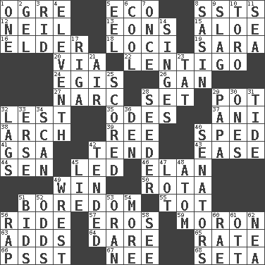 ACROSS 1. Legendary monster 5. Environmental prefix 8. Fast planes 12. Famous astronaut Armstrong 13. Immeasurably long periods of time 15. _ vera 16. A person who is older than you are 18. Locales 19. "Two Mules for Sister ____" 20. By way of 22. Small, flat, pigmented spot on the skin 24. Armor plate that protects the chest 26. Separate the seeds from cotton 27. Drug cop 28. Arrange properly for use 29. Cooking vessel 32. For fear that 35. Lyric poems 37. Cuckoo 38. Bowlike part 39. To riddle 40. Broke a traffic law 41. Girls' org. (abbr.) 42. Watch over 43. Relaxation 44. Elected rep. 45. Directed 46. Flair 49. Acquire through effort 50. Round or rotation of duties 51. Mood resulting from idleness 55. Small child 56. Travel on an animal 57. Greek god of love 59. Person of subnormal intelligence 63. Sums up 64. Have the gumption 65. Pace 66. Inconspicuous attention getter 67. Born 68. Bristle DOWN 1. Single 2. Set 3. To free from 4. Veterans Day date 5. Snakelike fish 6. Calm and collected 7. Single time 8. Indian antelope 9. Volcanic refuse 10. "Corrida" creature 11. Ocean 14. Scorches 17. Port city in Latvia 21. Wind 23. Make lace 25. Tallied 28. Sowing specialist 29. Dad 30. Washington bills 31. Event that recurs at intervals 32. Fails to keep up a pace 33. Celtic language 34. Skim 36. Lair 40. Elected representatives 42. Looked after 45. Falsehood 47. Car dealer's back yard 48. Smallest unit of an element 49. Obtain by seizing forcibly or violently 51. Auction offers 52. Likelihood 53. Northwest Algerian city 54. Greater amount 56. Strike 58. Observe 60. Actress Charlotte 61. Baseball player Mel 62. Teachers' org.