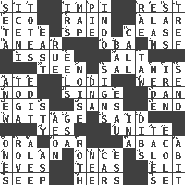 ACROSS 1. Be seated 4. Body of Kaffir warriors 8. State of inaction 12. Environmental prefix 13. Precipitation 14. Having or resembling wings 15. False hair 17. Hurried 18. Stop 19. Approach 21. Chief or king in Benin or Nigeria 23. Science/research agcy. 24. Come out of 26. Keyboard modifier key 28. Adolescent 30. Deli grouping 34. Had dinner 37. Farming town in central California 39. Past tense of be (plural) 40. Dreamland 41. Burn superficially 43. One of the 12 tribes of Israel 44. The front part of a cuirass 46. Without 47. Conclude 48. Electrical Measurement 51. Alleged 54. Affirmative reply 55. Join together 58. Mouth or opening 61. Boat paddle 63. Phillipine bananalike plant 65. Pitcher Ryan 67. At one time in the past 71. Oscar Madison type 72. Nights before holidays 73. Afternoon social gatherings 74. Connecticut Ivy Leaguer 75. Ooze 76. Possessive pronoun 77. Arrange properly for use DOWN 1. Stalk of a moss capsule 2. Ancient Celtic tribe of eastern Britain 3. Hauls 4. Big collection agency 5. Atlas unit 6. Sliced dessert 7. Southeast Asian peninsula 8. Actress Charlotte 9. Flair 10. Backtalk 11. Unclean, religiously 16. 90 degrees 18. Give a ring to 20. Regret 22. Sound made by sheep 25. Snakelike fish 27. The 23rd letter of the Hebrew alphabet 29. Annoying sound 30. Public displays of written messages 31. Ancient Persian 32. SW Asia republic 33. Transmit 34. Afresh 35. Ancient Roman robe 36. Prepare for publication 38. Heredity factor (abbr.) 42. He sold his birthright 45. Filthy place 49. A really long time 50. Girls' org. (abbr.) 52. _ tizzy (2 wds.) 53. Claim 56. Lies 57. Learning spot: Fr. 58. Singles 59. Be footloose 60. Toward shelter 62. Writer of Portnoy's Complaint (1969) 64. "This won't hurt ____!" 66. Cleo's killer 68. Born 69. Automobile 70. Double-curved letter