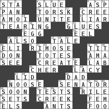 ACROSS 1. R.R. building 4. Change direction abruptly 8. Viper 11. Baking dish 12. Cod relative 14. Algonquian 15. Mine, in Marseilles 17. Join together 18. One who doesn't tell the truth 19. Separating forcefully 21. Cements 23. Ovum 24. Snakelike fish 25. In addition 27. Lie 30. Connecticut Ivy Leaguer 31. Full of chinks, cracks, or crevices 34. Teat (slang) 37. Spanish title 38. Lugs 39. Nursemaid (var.) 40. Observe 41. Cause to be 43. Experiment locale 44. "Mermaids" star 45. Made of lace 47. Hat (slang) 49. June honoree 50. Trap for birds or small mammals 52. Elected representative 56. Within a short period 57. Trials 60. Cause heat under the collar 61. Arranges properly for use 62. Small stream 63. Opposite of masc. 64. Raised railways 65. Pismires 66. Egg _ yung DOWN 1. Petty quarrel 2. Not wild 3. Small Philippine buffalo 4. Feeling sharp psychological pain 5. Yearn 6. RI univ. 7. Eastern Standard Time (abbr.) 8. Satellite of Uranus 9. Oceans 10. For each 13. Barrel 14. A slight indication 16. Angers 20. Composer Stravinsky 22. Area sheltered from the wind 25. Medicinal plant 26. Actor's bit 27. Carrier 28. Toward the sea 29. For fear that 30. Begley and Asner 32. Hankering 33. Greater amount 34. Baby powder 35. "If ____ say so..." 36. Bar bill 42. Liveliness 44. Music discs 46. The sixth month of the Jewish calendar 47. Plunders 48. Charged atoms 49. Writing tables 50. Christmas carol 51. And so on (abbr.) 52. Proofreading order 53. Small quarrel 54. Butter sub 55. San ____ (Riviera town) 56. Compass dir. 58. Epoch 59. Elected rep.
