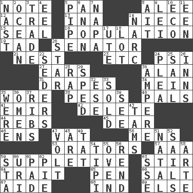 ACROSS 1. Short letter 5. Baking dish 8. Toward shelter 12. Land measure 13. _ tizzy (2 wds.) 14. Sibling's daughter 15. Lick closed 16. Census information 19. Bit 20. Legislator 21. Egg locale 23. And so on (abbr.) 24. 23rd letter of the Greek alphabet 27. Hearing organs 30. Actor Alda or Thicke 31. Window treatments 34. Count _ (2 wds.) 35. Had on 38. Mexican monetary units 40. Friends 41. Arab leader 42. Keyboard key 44. Confederate soldiers (slang) 45. Letter starter 46. Followers of ems 47. Large container 50. Not women's 53. Speakers 57. American Automobile Association (abbr.) 59. Supplementary 63. Commotion 64. Distinguishing feature 65. Animal enclosure 66. Table seasoning 67. Helper 68. Working for oneself (abbr.) 69. Otherwise DOWN 1. Political cartoonist Thomas 2. Sea 3. Buy and sell 4. Snakelike fish 5. Corncob 6. Soon (poet.) 7. California wine valley 8. Small island 9. Luau accessory 10. Environmental prefix 11. Car or cant ending 14. Drug cop 17. Shoshoni 18. Car dealer's back yard 20. Play the lead 22. Spring feasts 24. Entreaty 25. Travel by water 26. Restaurants 28. Hit sharply and swiftly 29. Hurried 30. Electrical Unit 32. Compass dir. 33. Exchanged or delivered for money 35. Past tense of be (plural) 36. Sign of something about to happen 37. Chest bones 39. Observe 43. Scottish caps 47. Electrical Unit 48. "We ___ not amused" (Victoria) 49. Make lace 51. Brizilian seaport 52. Travels by water 54. Native american tent (variation) 55. Baking chamber 56. Tear apart 58. Johnson of "Laugh-In" 59. R.R. building 60. RI univ. 61. Writing tablet 62. Sliced dessert 63. Compass dir.