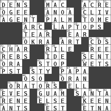 ACROSS 1. Lairs 5. Big _ 8. 43,560 square feet 12. Double curve, resembling the letter S 13. Small Philippine buffalo 15. 154 in Roman numerals 16. Representative 18. Inside of hand 19. Heavy book 20. Curve 22. Portable computers 24. Separate forcefully 26. Hearing organ 27. Gumbo ingredient 28. Tate display 29. Music discs 32. Burn to charcoal 35. Cause heat under the collar 37. To separate or throw off 38. Confederate soldiers (slang) 39. Binary compound 40. Transmitted 41. Mouth or opening 42. Obstruct or block passage 43. Moistens 44. Pacific Standard Time (abbr.) 45. Filthy place 46. Dad 49. Bear (Spanish) 50. NW Algerian seaport 51. Speakers 55. Pipe bend 56. Nights before holidays 57. Island territory of the United States 59. Before Barbara or Clara 63. French philosopher Descartes 64. Otherwise 65. Peachy ____! 66. Pismires 67. Eastern Standard Time (abbr.) 68. Inactive volcano in Sicily DOWN 1. ___ good deed 2. Oval reproductive body of a fowl 3. Born 4. Legislators 5. Atlas unit 6. Of or related to the anus 7. Root beer relative 8. Thespian 9. Hoof sound 10. Basketball hoops 11. First lady 14. Electrical Unit 17. Long journey 21. 4-wheeled motor vehicle 23. Make lace 25. Noteworthy scarcity 28. City in Syria 29. Algonquian 30. Gouge 31. Arranges properly for use 32. Riding implement 33. Possessive pronoun 34. Blind as ____ 36. Wedding promise 40. Tchaikovsky ballet 42. Moe Howard, for one 45. Fast jet (abbr.) 47. "We ___ not amused" (Victoria) 48. Friends 49. Fertile tracts in a desert 51. Baking chamber 52. Monthly bill 53. Court order 54. Backtalk 56. Period 58. Was introduced to 60. Fish or hair follower 61. "___ Little Indians" 62. Santa ___, CA