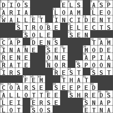 ACROSS 1. "Vaya con ____" 5. Raised railways 8. Viper 11. Roberta Peters solo 12. Rich soil 13. Lion 14. Place for singles 17. Happening 19. Disco prop 21. Chooses 22. Flatfish 23. Elected rep. 24. Head covering 27. Cub Scout units 29. Scottish cap 32. Empty; void 34. Put into a specified state 36. Method 37. French philosopher Descartes 38. Single 39. Capital of Western Samoa 40. Assign a rank or rating to 41. Not either 42. Soup utensil 43. Big collection agency 44. Repose 46. Fast jet (abbr.) 47. Opposite of masc. 50. Not this but _ 52. Unrefined 55. Oozed 57. One to whom something is allotted 59. Fragments 62. Flowery wreath 63. Celtic language 64. Fastener 65. Car dealer's back yard 66. Mayday 67. Inactive volcano in Sicily DOWN 1. Obsolete 2. Retirement account (abbr.) 3. Lubricates 4. Table seasonings 5. A really long time 6. Shoestrings 7. Grin 8. Actor Baldwin 9. Transmitted 10. Cooking vessels 12. Untruth 15. Eat (away) 16. Lacquered or enameled metalware 18. Lair 20. Gillaume's butler role 24. High-altitude cloud 25. Approach 26. Leg coverings 28. Sir (Sp.) 29. Traditional theme or motif 30. Goodbye (Sp.) 31. Intended 33. Born 35. Cigar-shaped 36. Atlas unit 42. Staphylococcus 45. "______ My Girl" (Turtles hit) 47. Away 48. _____ Park, CO 49. Paris' subway 51. Laconic 52. Give a ring to 53. Butter sub 54. Set down 55. Observe 56. Undesirable depression on a surface 58. Double-curved letter 60. One of the 12 tribes of Israel 61. Health resort