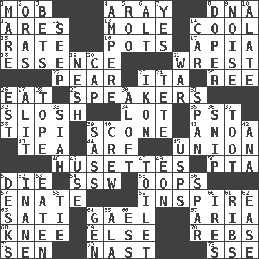 ACROSS 1. Disorderly crowd 4. Like ___ of sunshine 8. Heredity factor (abbr.) 11. Ancient Greek god of war 13. Undercover agent 14. Calm and collected 15. Assign a rank or rating to 16. Plant holders 17. Capital of Western Samoa 18. Core 21. Take or capture by force 22. Lightbulb-shaped fruit 23. Call ___ day 25. To separate or throw off 26. Ingest 29. Orators 32. Splash clumsily 34. Car dealer's back yard 35. Pacific Standard Time (abbr.) 38. Native american tent (variation) 39. Biscuitlike quick bread 41. Small Philippine buffalo 43. Afternoon social gathering 44. Sandy's bark 45. The state of being joined or united 46. French bagpipes 50. Parent Teacher Association (abbr.) 51. Expire 54. Compass dir. 55. I made a mistake 57. Related on the mother's side 59. Stimulate to action 63. Suttee (variant) 64. Highlander 67. Roberta Peters solo 68. Leg joint 69. Otherwise 70. Confederate soldiers (slang) 71. Elected rep. 72. Political cartoonist Thomas 73. Compass dir. DOWN 1. Female horse 2. Mouths or openings 3. Stakes 4. Electrical Unit 5. Friend of Pooh 6. Keyboard modifier key 7. Consenting reply 8. Drug addict 9. Annoying sound 10. Having winglike extensions 12. Ooze 14. 4-wheeled motor vehicle 19. Soft 20. Head covering 21. Armed conflict 23. Visual representation of an object 24. Wig 26. Eastern Standard Time (abbr.) 27. Came down and settled, as after flight 28. Drink excessively 30. At or to great height 31. Connect, as a bridge 33. Thailand, formerly 36. Clip 37. A blast of a horn 39. Backtalk 40. Ship's personnel 42. Santa ___, CA 45. United States Postal Service (abbr.) 47. Purpose 48. Rest room 49. Period of immesurable duration 51. Writing tables 52. Empty; void 53. Ingested 56. Practice fight 58. Neckwear 60. Angers 61. Chest bones 62. Relaxation 64. Commissioned mil. rank 65. In the manner of 66. Double-curved letter