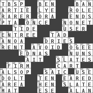 ACROSS 1. Cook's measure (abbr.) 5. Benjamin's nick name 8. Forbid 11. Nick name for Arthur 13. Sodium hydroxide 14. Hero or heavy, e.g. 15. More valued for its uncommonness 16. Mouth or opening 17. Extremities 18. Parent Teacher Assoc. 19. Single time 21. Music written for nine 22. Event that recurs at intervals 24. One who makes use of a thing 25. Main course 27. Bit 29. Small Philippine buffalo 30. Frees from moisture 32. Monthly bill 33. Prevent the occurrence of 35. Double curve, resembling the letter S 39. Ferber et al. 41. Religious women 42. Small island 43. Chalkboards 45. Unshakable 48. Heavy open wagon 49. Columnist Joseph or Stewart 50. Ketch in the Levant 52. Purpose 55. Stupid person 56. "___ Little Indians" 57. Having ears or earlike features 59. Length times width 60. Layer 61. Schedule 62. Floor covering 63. Compass dir. 64. Actor Alda or Thicke DOWN 1. Canvas cover 2. Naughty child 3. Ski resort town in Vermont 4. Sliced dessert 5. Group of countries in special alliance 6. Jane of fiction 7. Teachers' org. 8. Maid-servant 9. Tree or shrub in the Birch family 10. A home for chicks 12. Wear away 14. Vintage cars 20. Born 21. Naked 23. Feeling or showing extreme anger 25. Hearing organ 26. Compass dir. 27. Three (prefix) 28. Help 30. Two (Sp.) 31. Underwater navigation system 33. Black tropical American cuckoo 34. Large container 36. From the throat 37. Compass dir. 38. Double-curved letter 40. Moist 43. _-fi 44. Shoestrings 45. Plants 46. Small island 47. Round or rotation of duties 49. First man 50. Observes 51. Singer Murray 53. Bristle 54. Locale of original sin 56. Definite Article 58. In the manner of