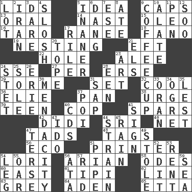 ACROSS 1. Flaplike coverings 5. The main thing one is thinking about 9. Smile enhancers 13. Of the mouth 14. Political cartoonist Thomas 15. Margarine 16. Edible starchy tuberous root 17. Indian princess (variant) 18. Papal veil 19. Snuggling 21. Bank Draft (abbr.) 22. Hollow 23. Toward shelter 24. Compass dir. 27. For each 28. Celtic language 29. Singer Mel 31. Arrange properly for use 32. Calm and collected 36. Writer Wiesel 37. Baking dish 38. Goad 39. Adolescent 40. Police officer (slang) 41. Practice fights 42. "You Light Up My Life" star Conn 44. _ Lanka 46. Remaining after all deductions 47. Small boys 48. Labels 50. Environmental prefix 51. Hard copy producer 54. Australian parrot (variant) 56. Believer in; advocate of (suffix) 58. Lyric poems 60. Compass direction 61. Native american tent (variation) 62. Actor's bit 63. Jennifer or Joel 64. Arabian gulf 65. Singer James DOWN 1. Car dealer's back yard 2. SW Asia republic 3. Have the gumption 4. Splash clumsily 5. Sillier 6. Mild oath, euphamism for damn 7. Compass dir. 8. Had dinner 9. Java holder (2 wds.) 10. Having winglike extensions 11. Writing instrument 12. "Barney Miller" actor Jack 17. Cause heat under the collar 20. Drink excessively 21. Raised railways 23. Tate display 24. Proofreading order 25. Not divided or shared with others 26. One of the Great Lakes 28. Car or cant ending 30. Ananias' fault 31. Plant excrement 33. NW Algerian seaport 34. Legendary monster 35. For fear that 37. Luau course 40. Music discs 41. Signal 43. Wedding promise 44. Put through a sieve 45. Water falling in drops from the sky 47. Laconic 49. Took without asking 51. Corncob 52. Prepare for publication 53. Monthly bill 54. Part of a journey 55. Boat paddle 56. _ moment's notice (2 wds.) 57. To free from 59. Ocean