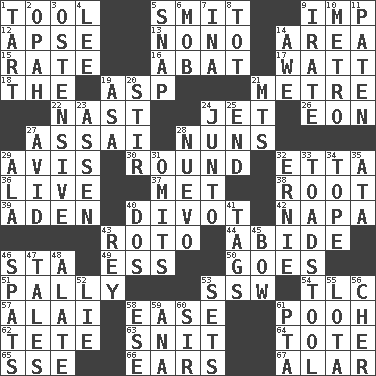 ACROSS 1. Instrument 5. Stricken, poetically 9. Mischievous child 12. Domed church section 13. Words to Nanette 14. Length times width 15. Assign a rank or rating to 16. Blind as ____ 17. Electrical Unit 18. Definite Article 19. Cleo's killer 21. Distance measurement (Brit.) 22. Political cartoonist Thomas 24. Passenger plane 26. Period of immesurable duration 27. Slender Brazilian palm 28. Religious women 29. Opinion 30. Single shot of ammunition 32. Singer James 36. Not recorded 37. Was introduced to 38. Carrot, for example 39. Arabian gulf 40. A piece of turf (Scot.) 42. California wine valley 43. Printing process, for short 44. Stay 46. R.R. building 49. Curvy letter 50. Leaves 51. Chummy 53. Compass dir. 54. Affectionate concern, for short 57. Jai _ 58. Comfort 61. "Silly old bear" 62. Wig 63. In a ____ (agitated or irritated) 64. Carryall 65. Compass dir. 66. Hearing organs 67. Having or resembling wings DOWN 1. Small pie 2. Brightly colored fish 3. Clearly or manifestly demonstrative 4. Area sheltered from the wind 5. Fastener 6. Disorderly crowd 7. _ tizzy (2 wds.) 8. Small child 9. Feeling or showing extreme anger 10. Paris' subway 11. Eucharist need 14. Deep reverence 19. White ___ sheet 20. Commotion 21. Mountains (abbr.) 23. NE Netherlands city 24. Secret group 25. Conclude 27. Enthusiastic 28. New (sp.) 29. Chicken ___ king 31. Leaves out 32. Bert's buddy 33. Inedible or poisonous agaric 34. Drink excessively 35. _ moment's notice (2 wds.) 40. Two (Sp.) 41. Labels 43. Marina Del _, California 45. Arrow shooter 46. Arguments over trivial matters 47. Falsehoods 48. Having winglike extensions 52. Untruth 53. Arranges properly for use 55. Globular water bottle used in Asia 56. "Mermaids" star 58. Compass dir. 59. Santa ___, CA 60. Title for a knight 61. Parent Teacher Assoc.