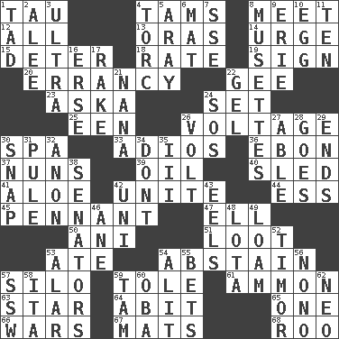 ACROSS 1. The 19th letter of the Greek alphabet 4. Scottish caps 8. Rendezvous 12. Everything 13. Mouths or openings 14. Goad 15. Prevent from occurring 18. Assign a rank or rating to 19. Omen 20. The state or an instance of erring 22. Turn to the right 23. "____ silly question..." 24. Put into a specified state 25. Car or cant ending 26. Electrical Measurement 30. Health resort 33. Goodbye (Sp.) 36. Inky black, to poets 37. Religious women 39. Petroleum 40. Downhill vehicle 41. Medicinal plant 42. Join together 44. Double-curved letter 45. Pre-World Series prize 47. Pipe bend 50. Cuckoo 51. Spoils 53. Had dinner 54. Refrain by choice 57. Grain storage tower 59. Lacquered or enameled metalware 61. ID or VA city 63. Play the lead 64. "This won't hurt ____!" 65. Single 66. Armed conflicts 67. Floor coverings 68. Friend of Pooh DOWN 1. Small amount or degree 2. Toward shelter 3. Extremist 4. Torque (variant) 5. Like ___ of sunshine 6. Floor covering 7. Compass dir. 8. French bagpipes 9. One of the Great Lakes 10. Ovum 11. Nine, plus one 16. Celtic language 17. Libertine 21. Grandmother 22. Set 24. Distress signal 26. Electrical Unit 27. Competent 28. Travels 29. Conclusions 30. Fastener 31. Whine 32. Soon (poet.) 34. Do not 35. One more than two 38. Elected representatives 42. Corn or form start 43. Snakelike fish 46. A saturated hydrocarbon 48. Globular water bottle used in Asia 49. Rich soil 52. Southeast Indonesia island 53. Having or resembling wings 54. Set down 55. Stakes 56. Words to Nanette 57. Compass dir. 58. Call ___ day 59. Scottish cap 60. Chief or king in Benin or Nigeria 62. Modern: prefix