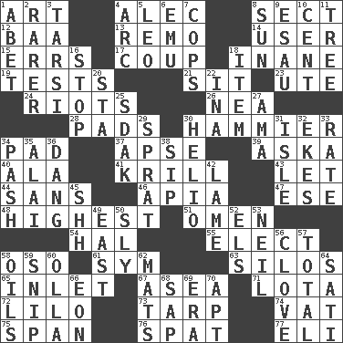 ACROSS 1. Nonscientific branch of learning 4. Actor Baldwin 8. Religious group 12. Sound made by sheep 13. San ____ (Riviera town) 14. One who makes use of a thing 15. Blunders 17. Overturn; upset 18. Empty; void 19. Trials 21. Be seated 23. Shoshoni 24. Debaucheries 26. Teachers' org. 28. Writing tablets 30. More overdramatic by comparison 34. Writing tablet 37. Domed church section 39. "____ silly question..." 40. Insect wing 41. Shrimp-like planktonic crustaceans 43. Allow 44. Without 46. Capital of Western Samoa 47. Compass dir. 48. Having the greatest elevation 51. Sign of something about to happen 54. Actor Linden 55. Choose 58. Bear (Spanish) 61. Symbol (abbr.) 63. Grain storage towers 65. An arm off of a larger body of water 67. Toward the sea 71. Globular water bottle used in Asia 72. _ and Stitch 73. Canvas cover 74. Large container 75. Connect, as a bridge 76. Petty quarrel 77. Connecticut Ivy Leaguer DOWN 1. Collude with 2. More valued for its uncommonness 3. Tarsus (plural) 4. Curve 5. Lion 6. Australian flightless bird 7. 911 reaches them 8. Player for Phoenix 9. He sold his birthright 10. Penny 11. Family _ (genealogy) 16. Constrict 18. A distinct part 20. R.R. building 22. _ tizzy (2 wds.) 25. Neighbor of Neb. 27. Housemaid (var.) 29. Small fatty European fish 30. Sun: prefix 31. Capri or Wight 32. Supplements with great effort 33. Pace 34. Romantic infatuation 35. Mountain range southwest of Kyrgyzstan 36. Mild oath, euphamism for damn 38. Small drink 42. Unable to walk 45. Quiet! 49. 90 degrees 50. Cunning 52. Raised railways 53. Famous astronaut Armstrong 56. Garlic unit 57. "_____ Recall" 58. Lubricates 59. Sever or remove by pinching or nipping 60. Water jar 62. Floor protectors 64. Suttee (variant) 66. Period of immesurable duration 68. Plant excrement 69. Epoch 70. Fitting